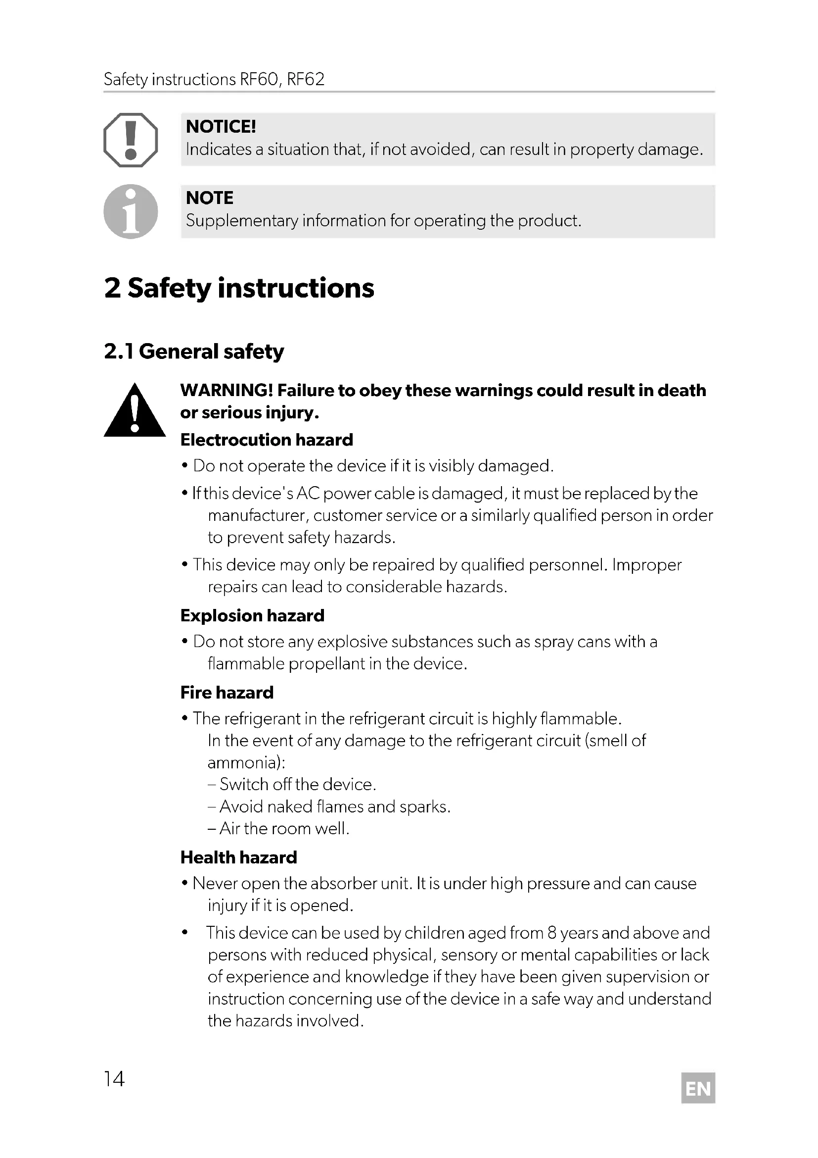 - This device can be used by children aged from 8 years and above and persons with reduced physical, sensory or mental capabilities or lack of experience and knowledge if they have been given supervision or instruction concerning use of the device in a safe way and understand the hazards involved. NOTICE! Indicates a situation that, if not avoided, can result in property damage. NOTE Supplementary information for operating the product.EN RF60, RF62 Safety instructions