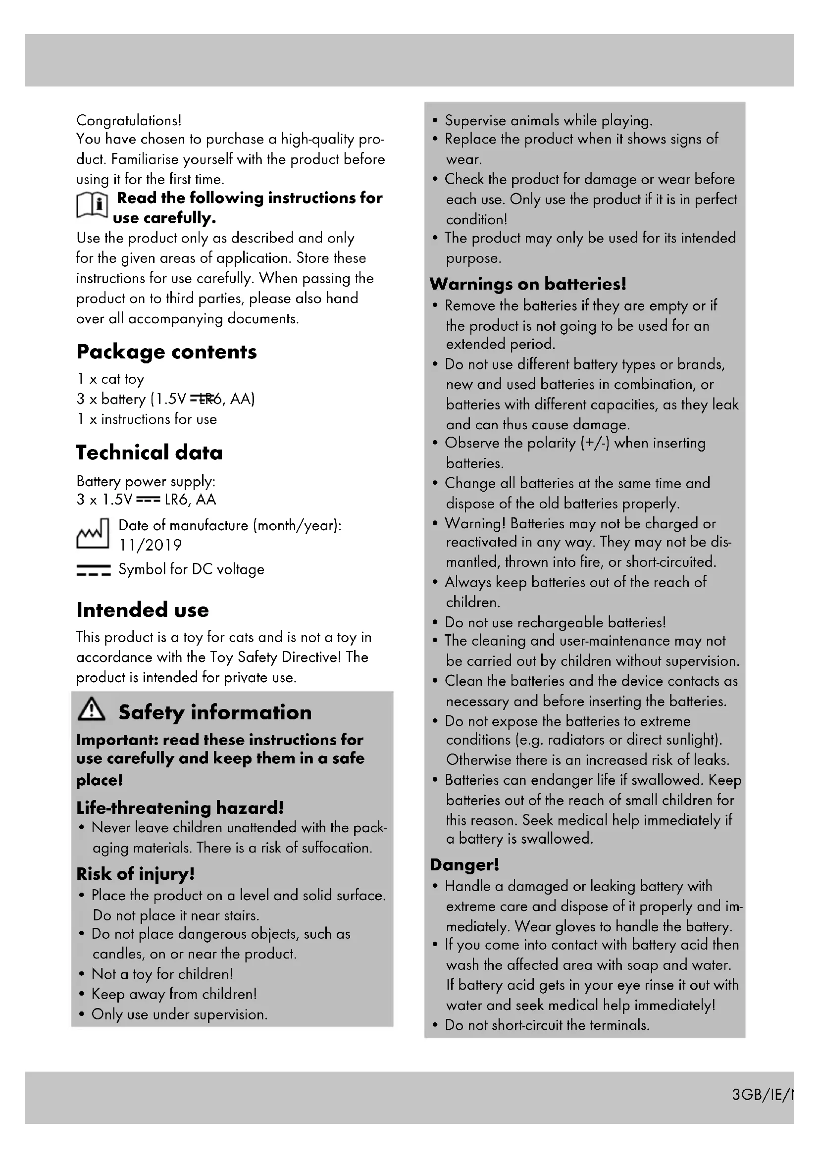 Congratulations! You have chosen to purchase a high-quality pro- duct. Familiarise yourself with the product before using it for the first time. Read the following instructions for use carefully. Use the product only as described and only for the given areas of application. Store these instructions for use carefully. When passing the product on to third parties, please also hand over all accompanying documents. Package contents 1 x cat toy 3 x battery (1.5V LR6, AA) 1 x instructions for use Technical data Battery power supply: 3 x 1.5V LR6, AA Date of manufacture (month/year): 11/2019 Symbol for DC voltage Intended use This product is a toy for cats and is not a toy in accordance with the Toy Safety Directive! The product is intended for private use. Safety information Important: read these instructions for use carefully and keep them in a safe place! Life-threatening hazard!