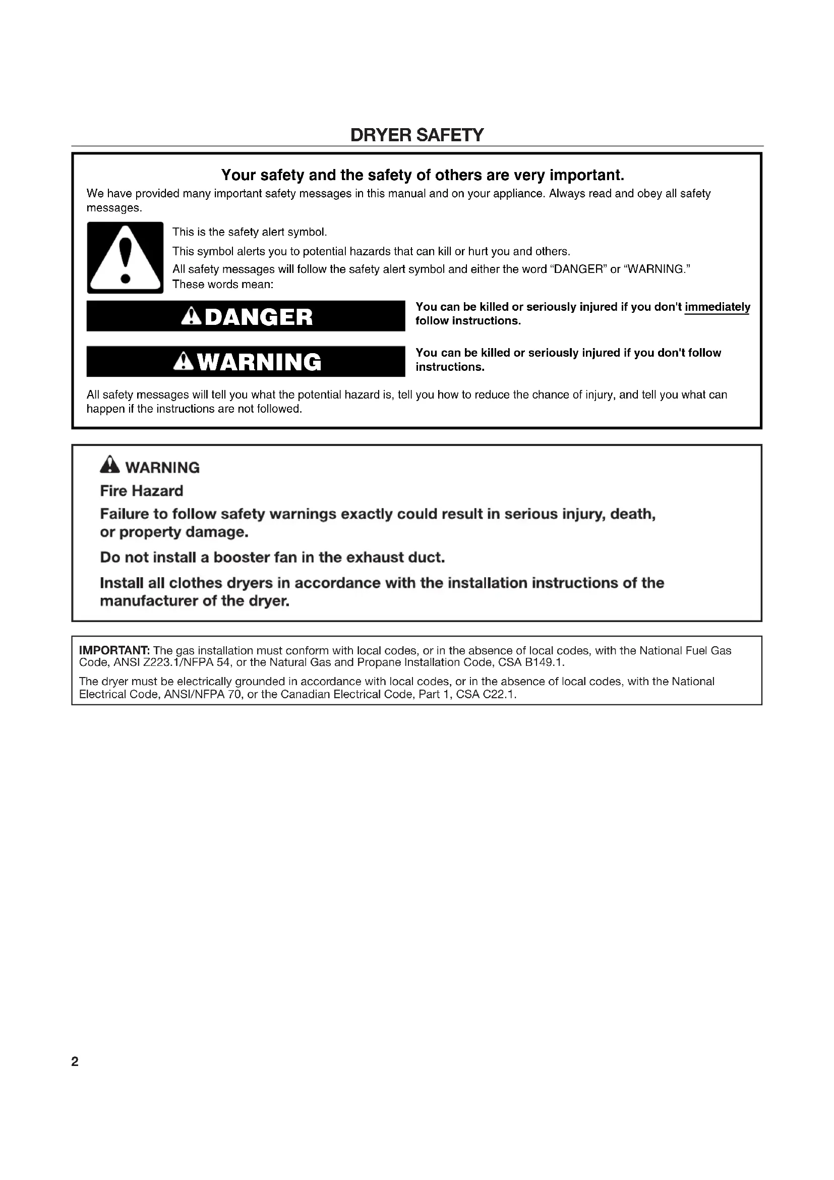 Table of Contents Table des matières Índice Dryer Installation and Care Instructions Manual Manuel d’instructions concernant l’installation et l’entretien de la sécheuse Manual de instrucciones de instalación y cuidado de la secadora2 DRYER SAFETY You can be killed or seriously injured if you don't immediately You can be killed or seriously injured if you don'tfollow All safety messages will tell you what the potential hazard is, tell you how to reduce the chance of injury, and tell you what can happen if the instructions are not followed. Your safety and the safety of others are very important. We have provided many important safety messages in this manual and on your appliance. Always read and obey all safety messages.This is the safety alert symbol.This symbol alerts you to potential hazards that can kill or hurt you and others.All safety messages will follow the safety alert symbol and either the word “DANGER” or “WARNING.”These words mean:follow instructions.instructions. DANGER WARNING IMPORTANT: The gas installation must conform with local codes, or in the absence of local codes, with the National Fuel Gas Code, ANSI Z223.1/NFPA 54, or the Natural Gas and Propane Installation Code, CSA B149.1. The dryer must be electrically grounded in accordance with local codes, or in the absence of local codes, with the National Electrical Code, ANSI/NFPA 70, or the Canadian Electrical Code, Part 1, CSA C22.1.3 In the State of Massachusetts, the following installation instructions apply: ■ Installations and repairs must be performed by a qualified or licensed contractor, plumber, or gas fitter qualified or licensed by the State of Massachusetts. ■ Acceptable Shut-off Devices: Gas Cocks and Ball Valves installed for use shall be listed. ■ A flexible gas connector, when used, must not exceed 4 feet (121.9 cm).4