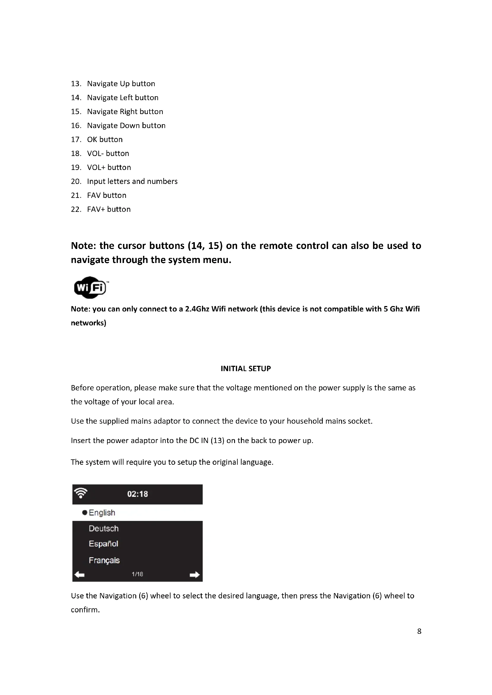 INITIAL SETUP Before operation, please make sure that the voltage mentioned on the power supply is the same as the voltage of your local area. Use the supplied mains adaptor to connect the device to your household mains socket. Insert the power adaptor into the DC IN (13) on the back to power up. The system will require you to setup the original language. Use the Navigation (6) wheel to select the desired language, then press the Navigation (6) wheel to confirm.9 Enable ‘Check Network when Power On’? Rotate the Navigation (6) wheel to select YES and press the Navigation (6) wheel to confirm. Now you can configure the wireless network.