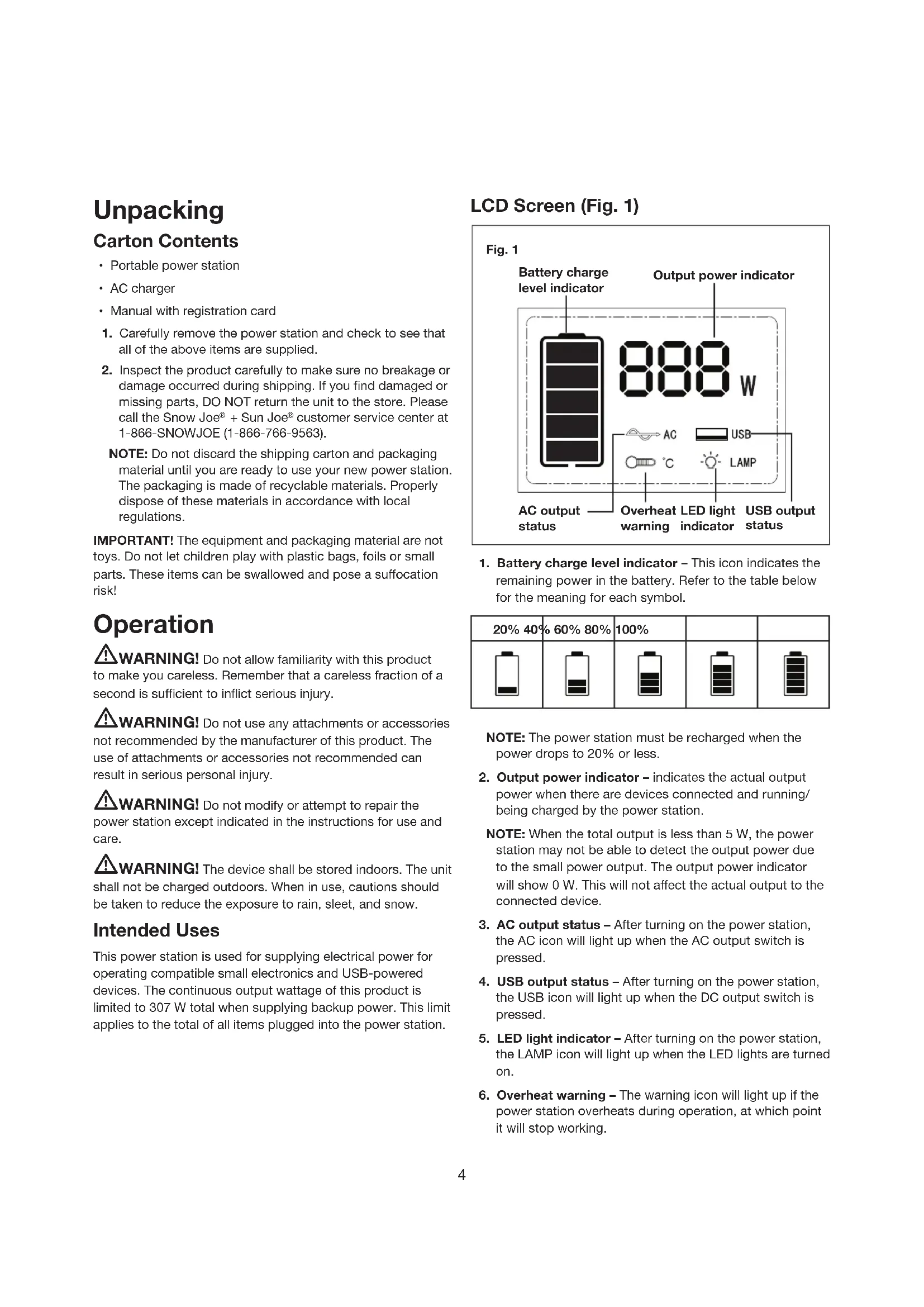 customer service center at 1-866-SNOWJOE (1-866-766-9563). NOTE: Do not discard the shipping carton and packaging material until you are ready to use your new power station. The packaging is made of recyclable materials. Properly dispose of these materials in accordance with local regulations. IMPORTANT! The equipment and packaging material are not toys. Do not let children play with plastic bags, foils or small parts. These items can be swallowed and pose a suocation risk! Operation mWARNING! Do not allow familiarity with this product to make you careless. Remember that a careless fraction of a second is sucient to inict serious injury. mWARNING! Do not use any attachments or accessories not recommended by the manufacturer of this product. The use of attachments or accessories not recommended can result in serious personal injury. mWARNING! Do not modify or attempt to repair the power station except indicated in the instructions for use and care. mWARNING! The device shall be stored indoors. The unit shall not be charged outdoors. When in use, cautions should be taken to reduce the exposure to rain, sleet, and snow. Intended Uses This power station is used for supplying electrical power for operating compatible small electronics and USB-powered devices. The continuous output wattage of this product is limited to 307 W total when supplying backup power. This limit applies to the total of all items plugged into the power station. LCD Screen (Fig. 1)