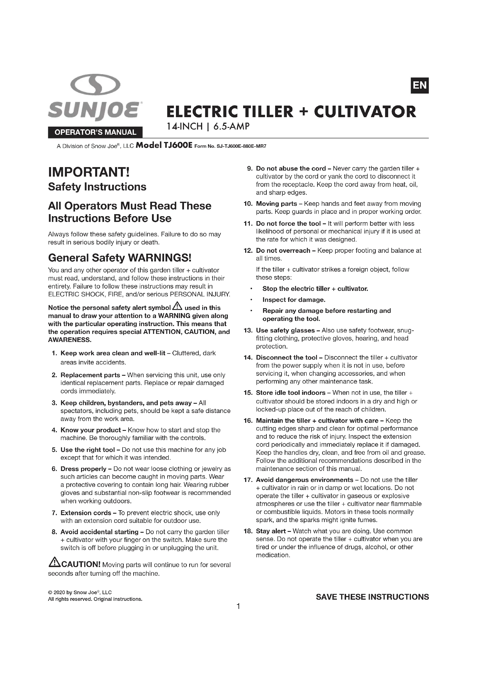 - Do not grasp the exposed cutting blades or cutting edges when picking up or holding the appliance.3 Stopping Work• Always turn the tiller + cultivator OFF and disconnect the electrical power when stopping work or when changing work areas. Never leave the machine running when unattended.• The blades will continue to rotate for a short period after turning OFF the tiller + cultivator. Wait until the blades have completely stopped before lifting the machine or conducting inspection and maintenance.• The motor housing remains hot for a short period after the machine is turned OFF. Allow the motor housing to cool completely before touching or storing near combustible material.Maintenance + Storage• Maintain or replace safety and instruction labels.• Disengage all controls, stop the engine, and wait until the blades come to a complete stop before cleaning, repairing, or inspecting the tiller + cultivator.• Regularly check the following:i) Blades are clear and can rotate freely – Accumulation of debris around the blades could impair performance or damage the motor. Inspect and clean the area around the blades before every use.ii) Safety devices are operating properly – Do not tamper with or adjust safety devices.iii) Bolts and screws are properly tightened – Visually inspect the machine for any damage and ensure that the tiller + cultivator is in safe working condition.iv) Use only identical replacement parts – Always replace damaged parts with original equipment manufacturer’s (OEM) parts only. Replacement parts that do not meet the original equipment specications may lead to improper performance and compromise safety.Double-Insulated AppliancesIn a double-insulated appliance, two systems of insulation are provided instead of grounding. No grounding means is provided on a double-insulated appliance, nor should a means for grounding be added to the appliance. Servicing a double-insulated appliance requires extreme care and knowledge of the system, and should be performed only by qualied service personnel at an authorized Snow Joe + Sun Joe