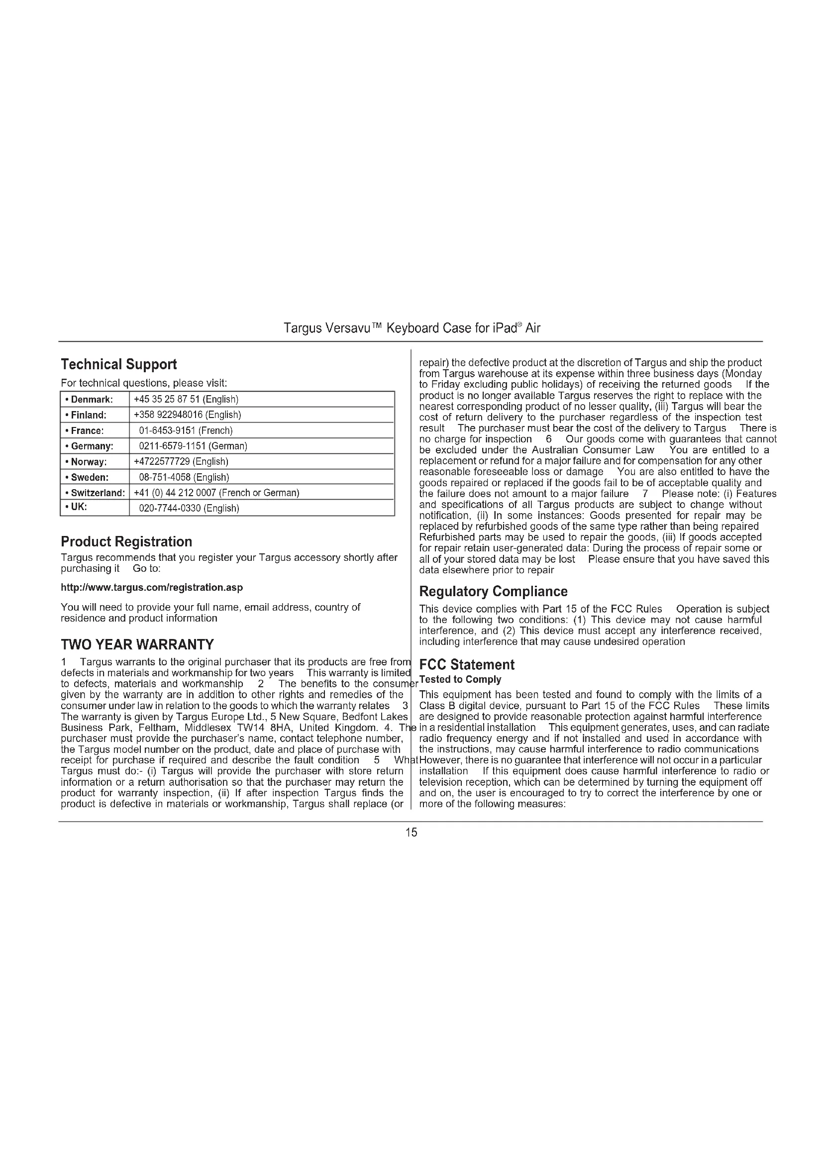 1 Targus warrants to the original purchaser that its products are free from defects in materials and workmanship for two years This warranty is limited to defects, materials and workmanship 2 The benefits to the consumer given by the warranty are in addition to other rights and remedies of the consumer under law in relation to the goods to which the warranty relates 3 The warranty is given by Targus Europe Ltd., 5 New Square, Bedfont Lakes Business Park, Feltham, Middlesex TW14 8HA, United Kingdom. 4. The purchaser must provide the purchaser’s name, contact telephone number, the Targus model number on the product, date and place of purchase with receipt for purchase if required and describe the fault condition 5 What Targus must do:- (i) Targus will provide the purchaser with store return information or a return authorisation so that the purchaser may return the product for warranty inspection, (ii) If after inspection Targus finds the product is defective in materials or workmanship, Targus shall replace (or repair) the defective product at the discretion of Targus and ship the product from Targus warehouse at its expense within three business days (Monday to Friday excluding public holidays) of receiving the returned goods If the product is no longer available Targus reserves the right to replace with the nearest corresponding product of no lesser quality, (iii) Targus will bear the cost of return delivery to the purchaser regardless of the inspection test result The purchaser must bear the cost of the delivery to Targus There is no charge for inspection 6 Our goods come with guarantees that cannot be excluded under the Australian Consumer Law You are entitled to a replacement or refund for a major failure and for compensation for any other reasonable foreseeable loss or damage You are also entitled to have the goods repaired or replaced if the goods fail to be of acceptable quality and the failure does not amount to a major failure 7 Please note: (i) Features and specifications of all Targus products are subject to change without notification, (ii) In some instances: Goods presented for repair may be replaced by refurbished goods of the same type rather than being repaired Refurbished parts may be used to repair the goods, (iii) If goods accepted for repair retain user-generated data: During the process of repair some or all of your stored data may be lost Please ensure that you have saved this data elsewhere prior to repair Regulatory Compliance This device complies with Part 15 of the FCC Rules Operation is subject to the following two conditions: (1) This device may not cause harmful interference, and (2) This device must accept any interference received, including interference that may cause undesired operation FCC Statement Tested to Comply This equipment has been tested and found to comply with the limits of a Class B digital device, pursuant to Part 15 of the FCC Rules These limits are designed to provide reasonable protection against harmful interference in a residential installation This equipment generates, uses, and can radiate radio frequency energy and if not installed and used in accordance with the instructions, may cause harmful interference to radio communications However, there is no guarantee that interference will not occur in a particular installation If this equipment does cause harmful interference to radio or television reception, which can be determined by turning the equipment off and on, the user is encouraged to try to correct the interference by one or more of the following measures: