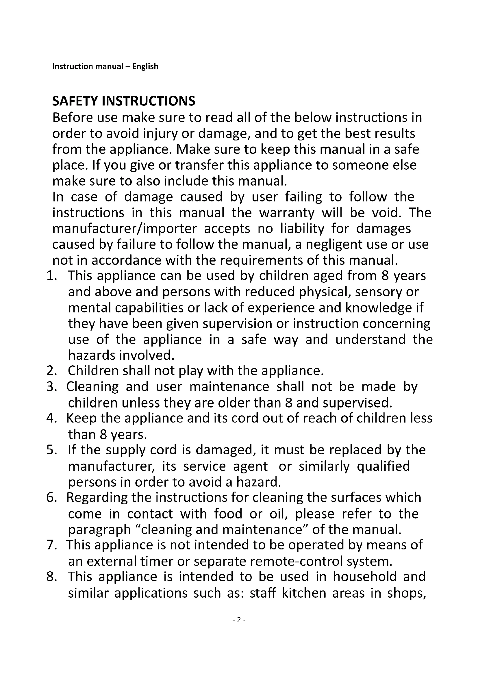 Before delivery our devices are subjected to rigorous quality control. If, despite all care, damage has occurred during production or transportation, please return the device to your dealer. In addition to statutory legal rights, the purchaser has an option to claim under the terms of the following guarantee: For the purchased device we provide 2 years guarantee, commencing from the day of sale. If you have a defective product, you can directly go back to the point of purchase. Defects which arise due to improper handling of the device and malfunctions due to interventions and repairs by third parties or the fitting of non-original parts are not covered by this guarantee. Always keep your receipt, without the receipt you can’t claim any form of warranty. Damage caused by not following the instruction manual, will lead to a void of warranty, if this results in consequential damages then we will not be liable. Neither can we hold responsible for material damage or personal injury caused by improper use if the instruction manual is not properly executed. Damage to accessories does not mean free replacement of the whole appliance. In such case please contact our service department. Broken glass or breakage of plastic parts is always subject to a charge. Defects to consumables or parts subjected to wearing, as well as cleaning, maintenance or the replacement of said parts are not covered by the warranty and are to be paid.