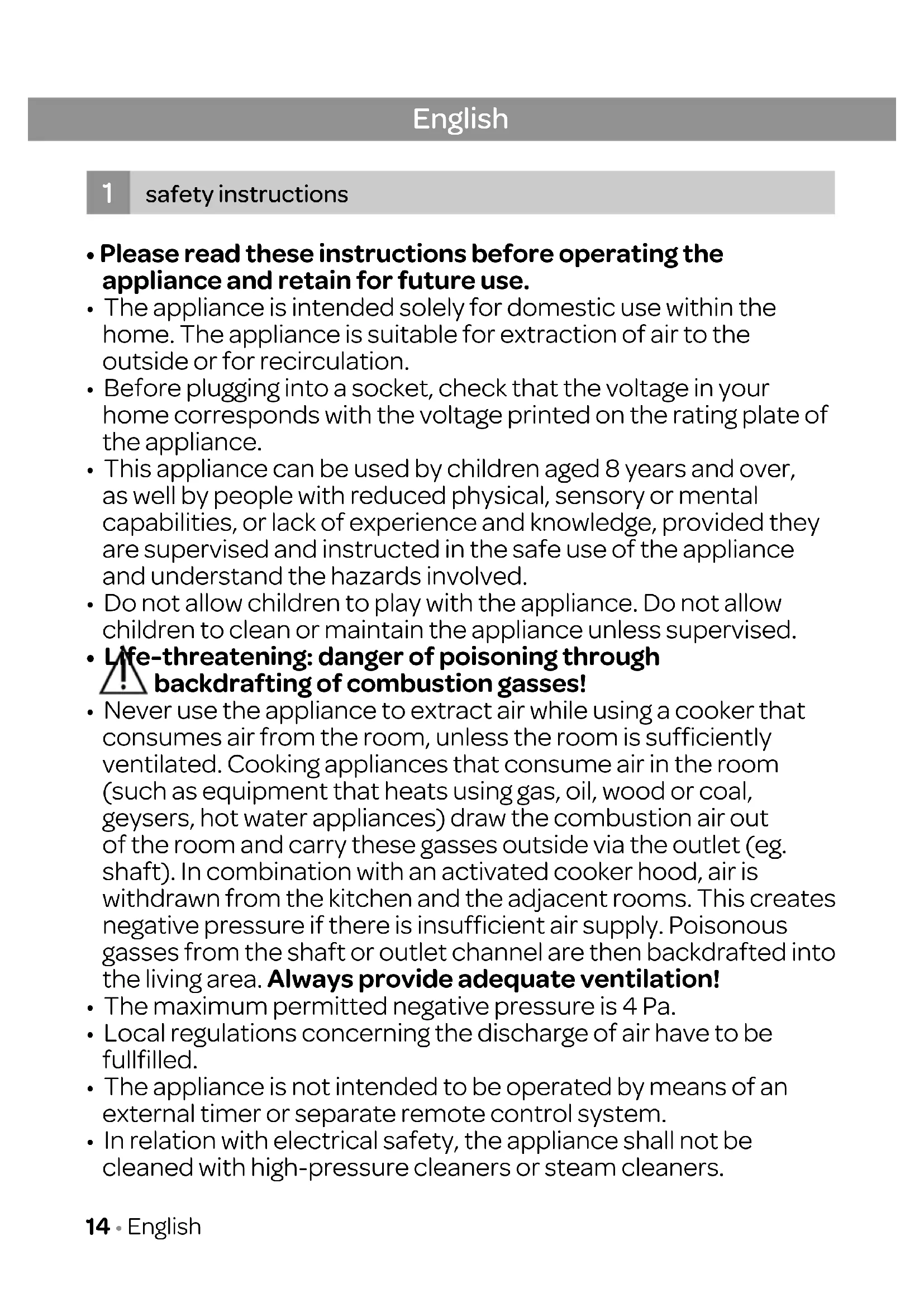 - Never use the appliance to extract air while using a cooker that consumes air from the room, unless the room is sufficiently ventilated. Cooking appliances that consume air in the room (such as equipment that heats using gas, oil, wood or coal, geysers, hot water appliances) draw the combustion air out of the room and carry these gasses outside via the outlet (eg. shaft). In combination with an activated cooker hood, air is withdrawn from the kitchen and the adjacent rooms. This creates negative pressure if there is insufficient air supply. Poisonous gasses from the shaft or outlet channel are then backdrafted into the living area. Always provide adequate ventilation!