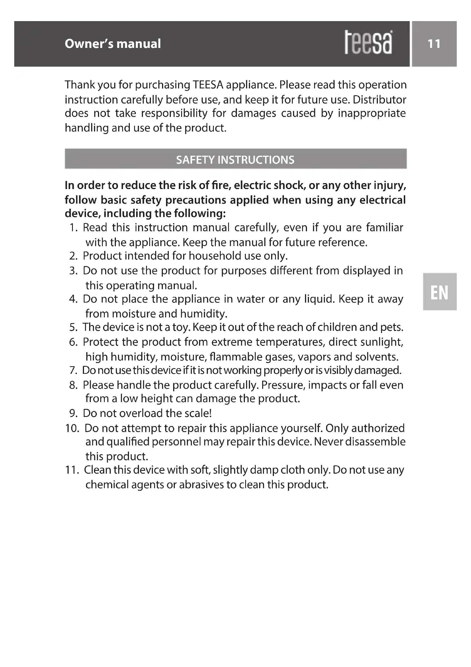 SAFETY INSTRUCTIONS Thank you for purchasing TEESA appliance. Please read this operation instruction carefully before use, and keep it for future use. Distributor does not take responsibility for damages caused by inappropriate handling and use of the product. In order to reduce the risk of re, electric shock, or any other injury, follow basic safety precautions applied when using any electrical device, including the following: