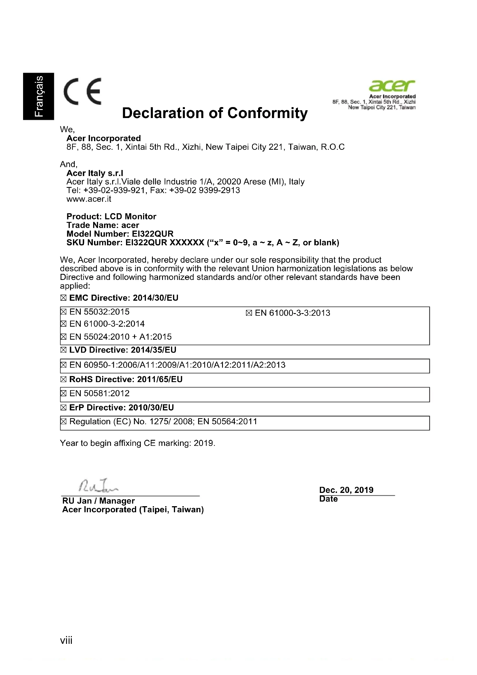 Download the instructions for your Monitor in PDF format for free! Find your manual EI322QURP - ACER and take your electronic device back in hand. On this page are published all the documents necessary for the use of your device. EI322QURP by ACER.
