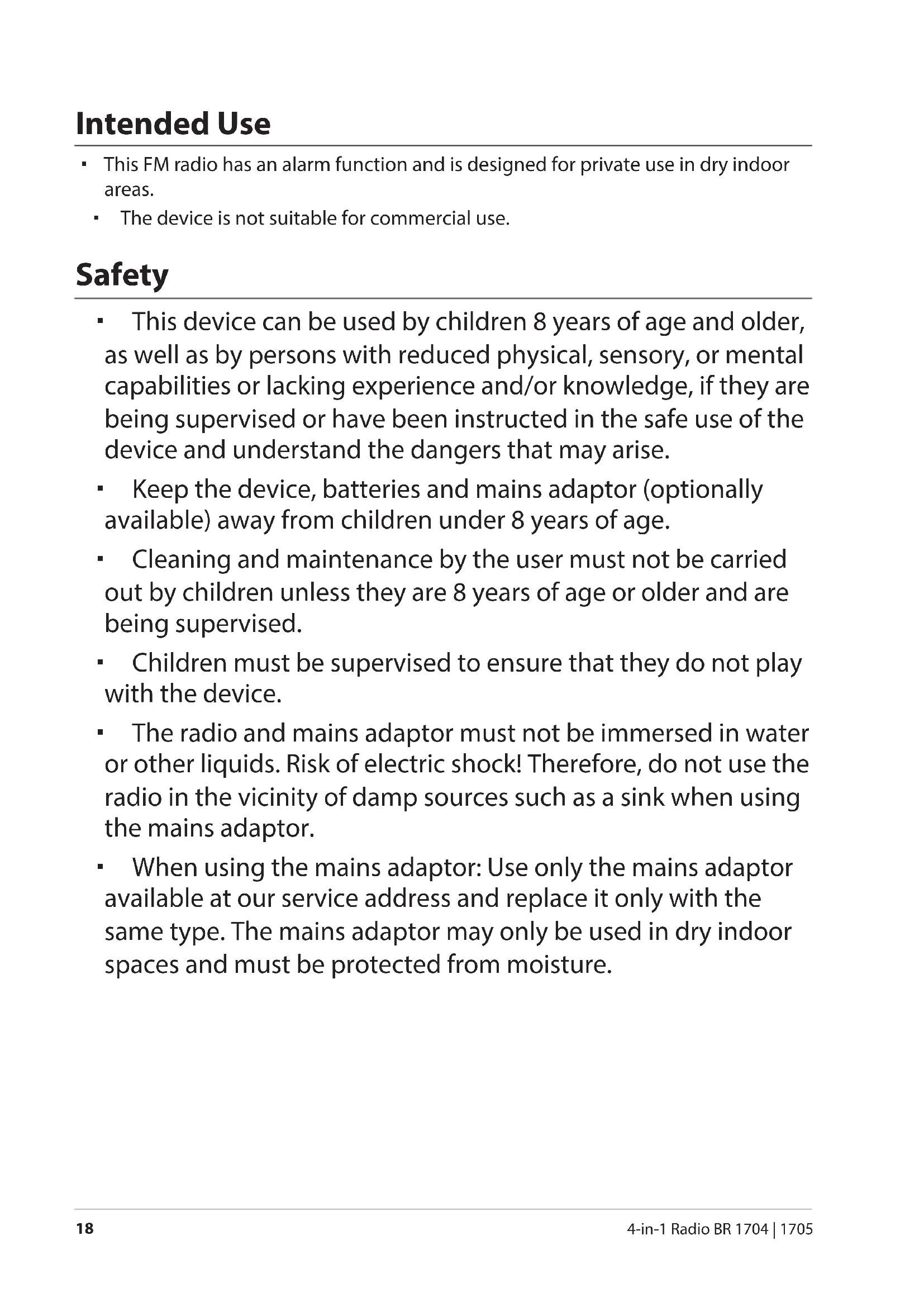 4-in-1 Radio BR 1704 | 1705 Intended Use This FM radio has an alarm function and is designed for private use in dry indoor areas. The device is not suitable for commercial use. Safety This device can be used by children 8 years of age and older, as well as by persons with reduced physical, sensory, or mental capabilities or lacking experience and/or knowledge, if they are being supervised or have been instructed in the safe use of the device and understand the dangers that may arise. Keep the device, batteries and mains adaptor (optionally available) away from children under 8 years of age. Cleaning and maintenance by the user must not be carried out by children unless they are 8 years of age or older and are being supervised. Children must be supervised to ensure that they do not play with the device. The radio and mains adaptor must not be immersed in water or other liquids. Risk of electric shock! Therefore, do not use the radio in the vicinity of damp sources such as a sink when using the mains adaptor. When using the mains adaptor: Use only the mains adaptor available at our service address and replace it only with the same type. The mains adaptor may only be used in dry indoor spaces and must be protected from moisture.Safety