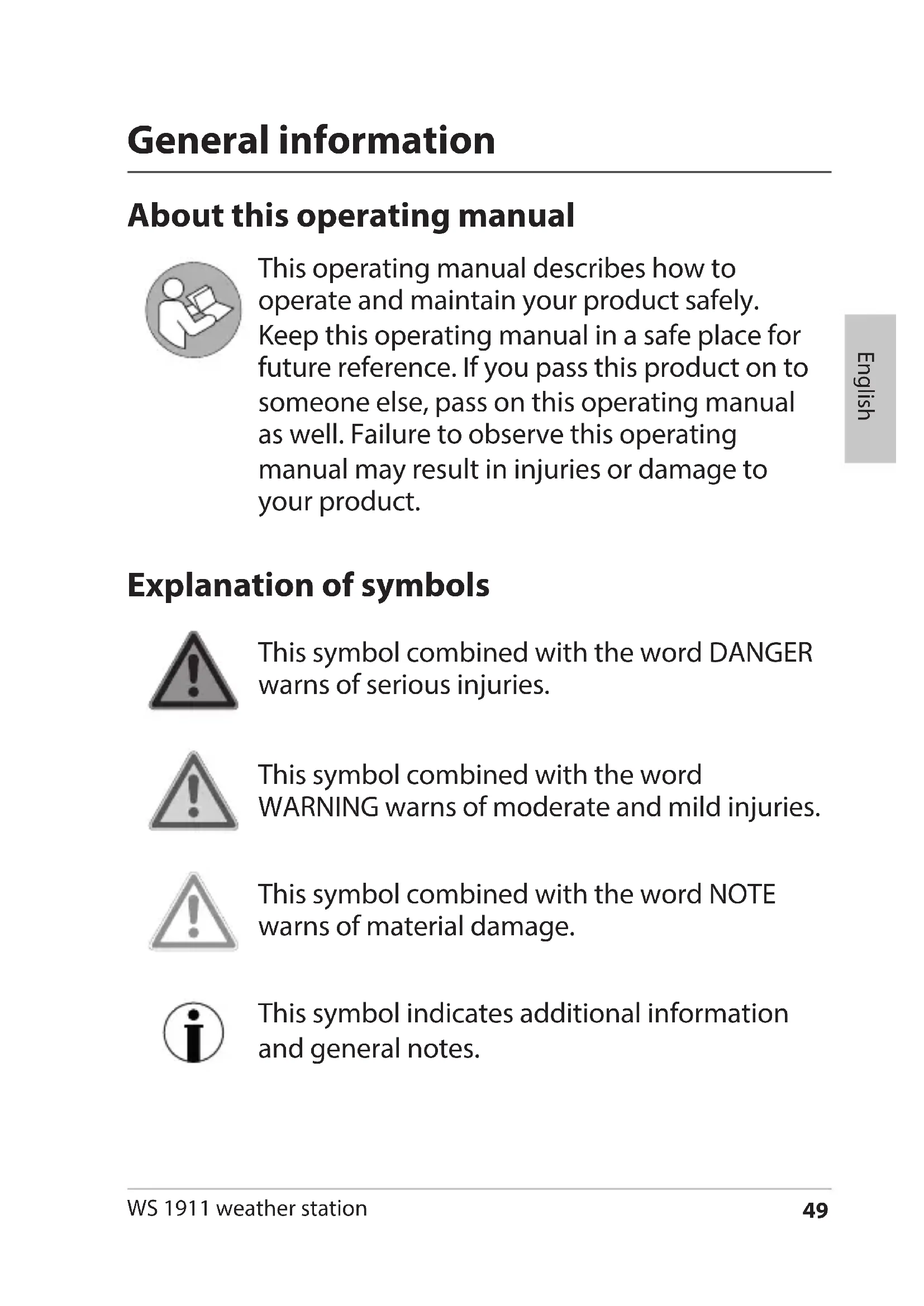 on the outdoor sensor.61 WS 1911 weather station English Base station The base station can only be operated with electricity. In the event of a power failure, the storage battery only ensures that the settings are saved for several hours and are not lost. Backup battery The base station can also be operated without a storage battery. However, operation with the storage battery alone is not possible.