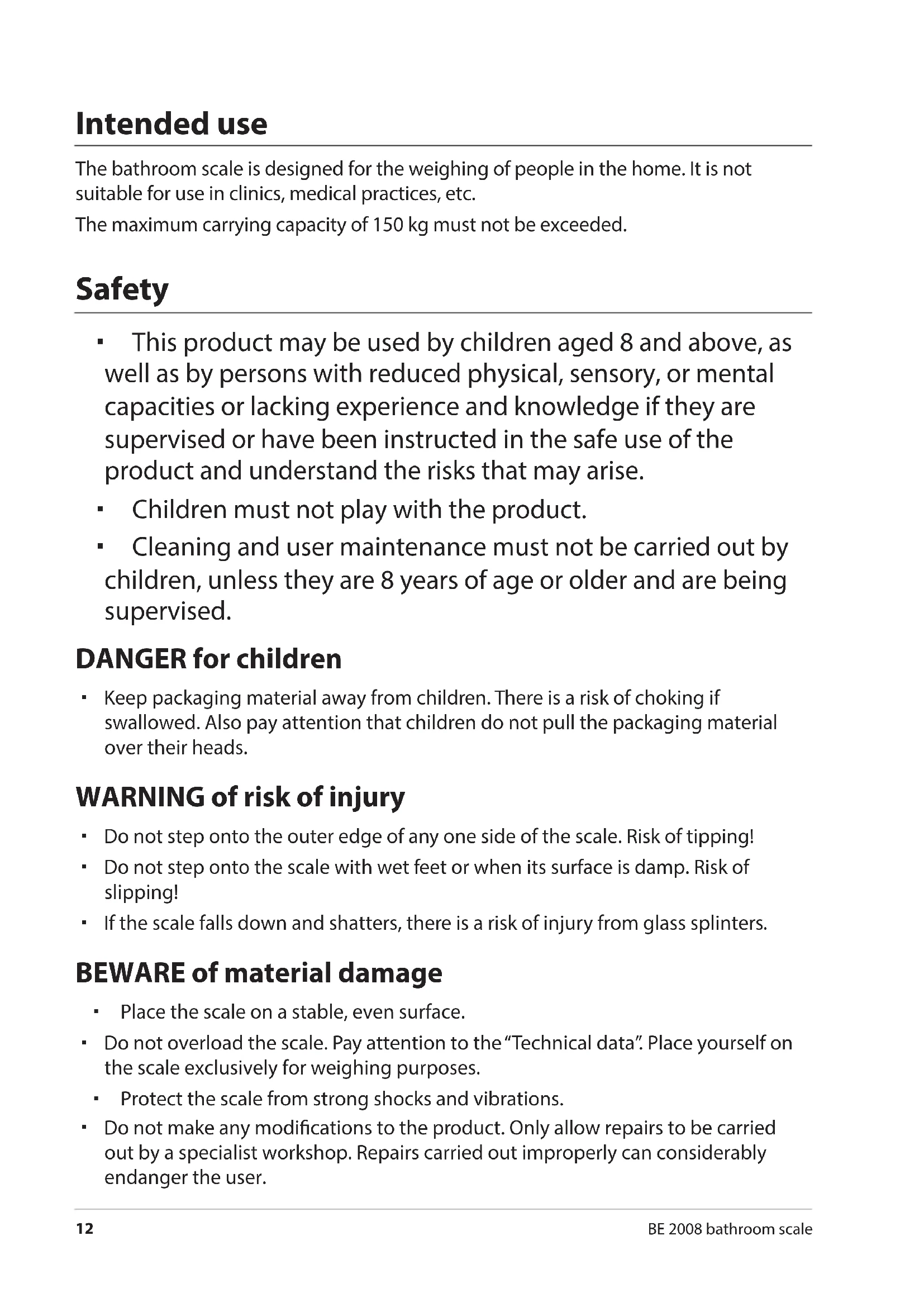 The bathroom scale is designed for the weighing of people in the home. It is not suitable for use in clinics, medical practices, etc.