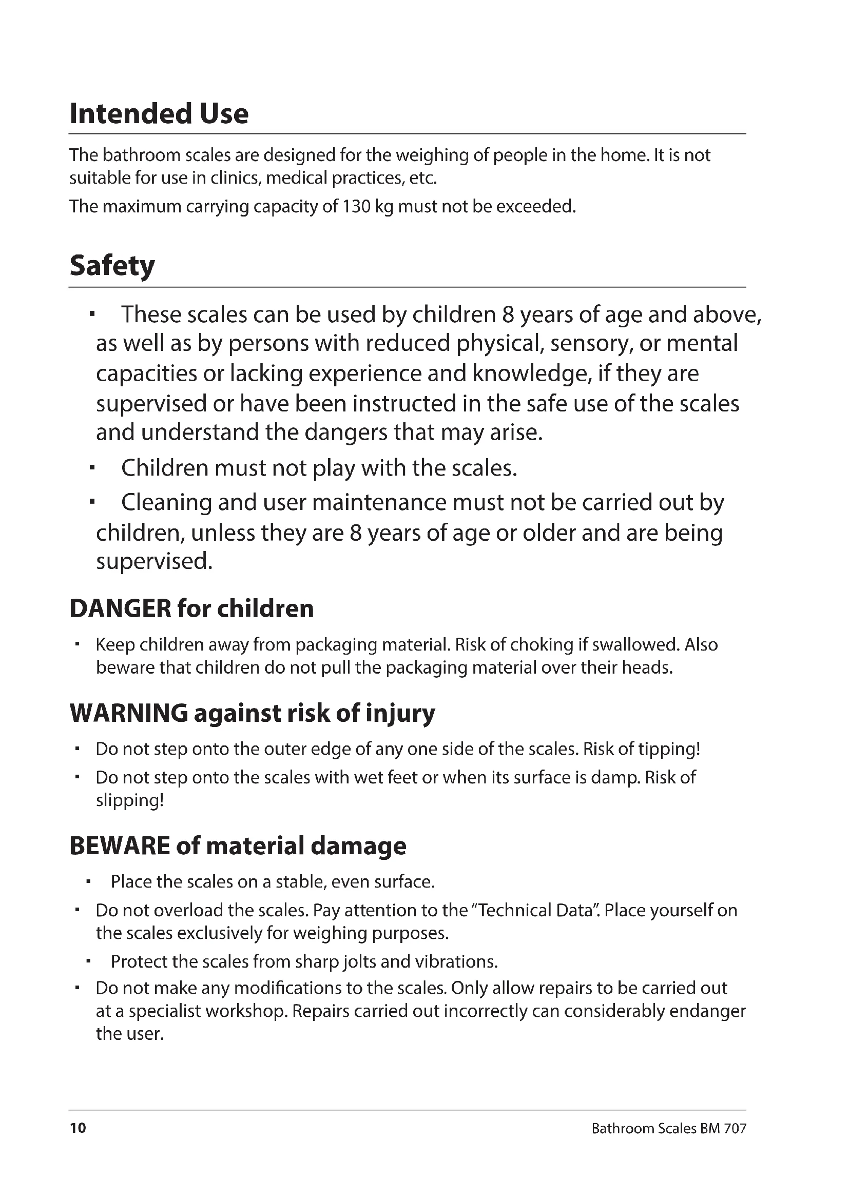 Bathroom Scales BM 707 Intended Use The bathroom scales are designed for the weighing of people in the home. It is not suitable for use in clinics, medical practices, etc. The maximum carrying capacity of 130 kg must not be exceeded. Safety These scales can be used by children 8 years of age and above, as well as by persons with reduced physical, sensory, or mental capacities or lacking experience and knowledge, if they are supervised or have been instructed in the safe use of the scales and understand the dangers that may arise. Children must not play with the scales. Cleaning and user maintenance must not be carried out by children, unless they are 8 years of age or older and are being supervised. DANGER for children Keep children away from packaging material. Risk of choking if swallowed. Also beware that children do not pull the packaging material over their heads. WARNING against risk of injury Do not step onto the outer edge of any one side of the scales. Risk of tipping! Do not step onto the scales with wet feet or when its surface is damp. Risk of slipping! BEWARE of material damage Place the scales on a stable, even surface. Do not overload the scales. Pay attention to the “Technical Data”. Place yourself on the scales exclusively for weighing purposes. Protect the scales from sharp jolts and vibrations. Do not make any modications to the scales. Only allow repairs to be carried out at a specialist workshop. Repairs carried out incorrectly can considerably endanger the user.Safety