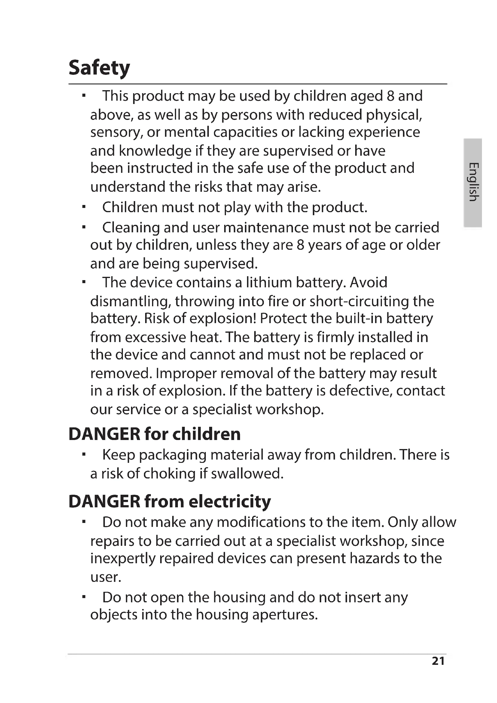 to “0 00”. Cleaning NOTE on material damage − Do not immerse the scale in water or other liquids. − Never use harsh, scouring or abrasive cleaning agents or the like to clean the scale. Otherwise, the surface could be scratched. The scale should be cleaned immediately after use, especially after its contact with fat, spices, vinegar, andother strongly flavoured and/or coloured foodstuffs. − Wipe the scale as needed with a slightly damp soft cloth. Avoid contact with citric acid.30 Fault/Remedy Fault Possible cause No function. The display shows “LO”orthe screen is out. The battery must be recharged as described in the “Charging the battery” section. “EEEE” is shown on the display. The maximum capacity of the scale (5kg) has been exceeded. The scale appears to be displaying wrong weighing results Is the scale located on afirm, even surface? Is a device that can cause electromagnetic disturbances located in the vicinity of the scale?31 English Technical data Model: KE 2100 kitchen scale “Nuria” Battery: Lithium battery
