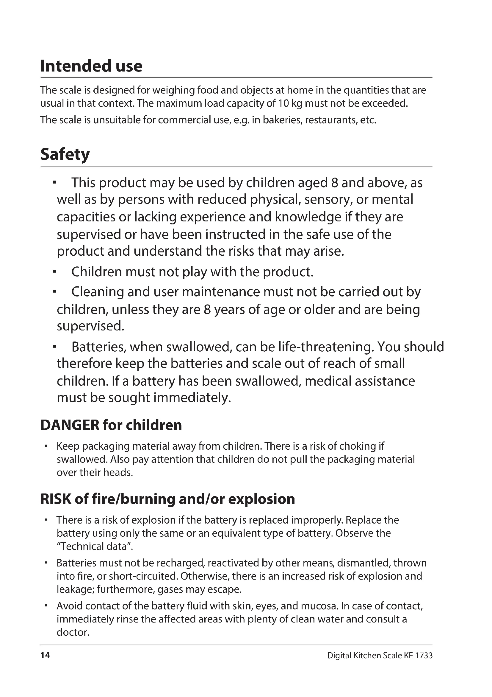 Digital Kitchen Scale KE 1733 Intended use The scale is designed for weighing food and objects at home in the quantities that are usual in that context. The maximum load capacity of 10 kg must not be exceeded. The scale is unsuitable for commercial use, e.g. in bakeries, restaurants, etc. Safety This product may be used by children aged 8 and above, as well as by persons with reduced physical, sensory, or mental capacities or lacking experience and knowledge if they are supervised or have been instructed in the safe use of the product and understand the risks that may arise. Children must not play with the product. Cleaning and user maintenance must not be carried out by children, unless they are 8 years of age or older and are being supervised. Batteries, when swallowed, can be life-threatening. You should therefore keep the batteries and scale out of reach of small children. If a battery has been swallowed, medical assistance must be sought immediately. DANGER for children Keep packaging material away from children. There is a risk of choking if swallowed. Also pay attention that children do not pull the packaging material over their heads. RISK of fire/burning and/or explosion There is a risk of explosion if the battery is replaced improperly. Replace the battery using only the same or an equivalent type of battery. Observe the “Technical data”. Batteries must not be recharged, reactivated by other means, dismantled, thrown into re, or short-circuited. Otherwise, there is an increased risk of explosion and leakage; furthermore, gases may escape. Avoid contact of the battery uid with skin, eyes, and mucosa. In case of contact, immediately rinse the aected areas with plenty of clean water and consult a doctor.Safety