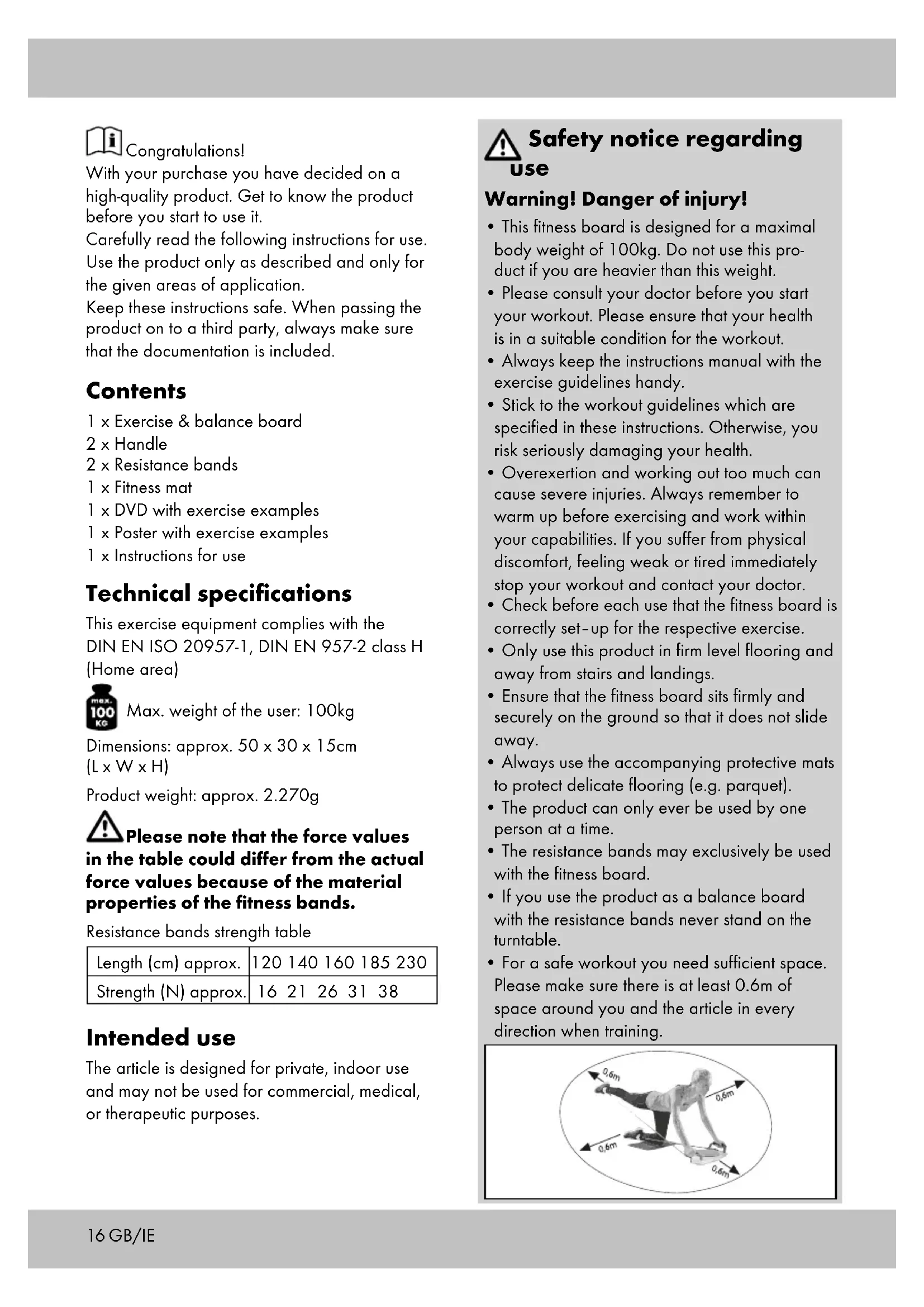 - For a safe workout you need sufficient space. Please make sure there is at least 0.6m of space around you and the article in every direction when training.17GB/IE Special caution – danger of injury for children!