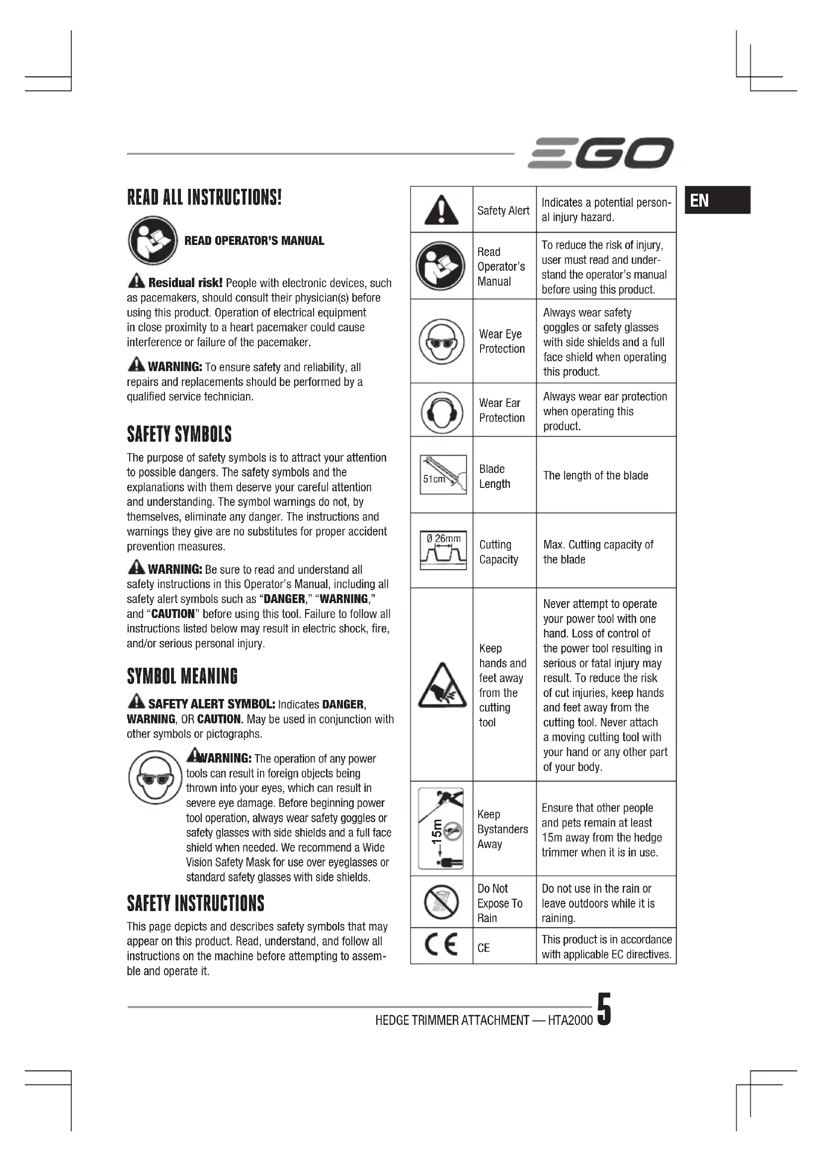 READ ALL INSTRUCTIONS! READ OPERATOR’S MANUAL Residual risk! People with electronic devices, such as pacemakers, should consult their physician(s) before using this product. Operation of electrical equipment in close proximity to a heart pacemaker could cause interference or failure of the pacemaker. WARNING: To ensure safety and reliability, all repairs and replacements should be performed by a qualied service technician. SAFETY SYMBOLS The purpose of safety symbols is to attract your attention to possible dangers. The safety symbols and the explanations with them deserve your careful attention and understanding. The symbol warnings do not, by themselves, eliminate any danger. The instructions and warnings they give are no substitutes for proper accident prevention measures. WARNING: Be sure to read and understand all safety instructions in this Operator’s Manual, including all safety alert symbols such as “DANGER,” “WARNING,” and “CAUTION” before using this tool. Failure to follow all instructions listed below may result in electric shock, re, and/or serious personal injury. SYMBOL MEANING SAFETY ALERT SYMBOL: Indicates DANGER, WARNING, OR CAUTION. May be used in conjunction with other symbols or pictographs. WARNING: The operation of any power tools can result in foreign objects being thrown into your eyes, which can result in severe eye damage. Before beginning power tool operation, always wear safety goggles or safety glasses with side shields and a full face shield when needed. We recommend a Wide Vision Safety Mask for use over eyeglasses or standard safety glasses with side shields. SAFETY INSTRUCTIONS This page depicts and describes safety symbols that may appear on this product. Read, understand, and follow all instructions on the machine before attempting to assem-ble and operate it.Safety AlertIndicates a potential person-al injury hazard.Read Operator’s ManualTo reduce the risk of injury, user must read and under-stand the operator’s manual before using this product.Wear Eye ProtectionAlways wear safety goggles or safety glasses with side shields and a full face shield when operating this product.Wear Ear ProtectionAlways wear ear protection when operating this product. 51cm Blade LengthThe length of the bladeØ 26mmCutting CapacityMax. Cutting capacity of the bladeKeep hands and feet away from the cutting tool Never attempt to operate your power tool with one hand. Loss of control of the power tool resulting in serious or fatal injury may result. To reduce the risk of cut injuries, keep hands and feet away from the cutting tool. Never attach a moving cutting tool with your hand or any other part of your body. 15m Keep Bystanders Away Ensure that other people and pets remain at least 15m away from the hedge trimmer when it is in use.Do Not Expose To Rain Do not use in the rain or leave outdoors while it is raining.
