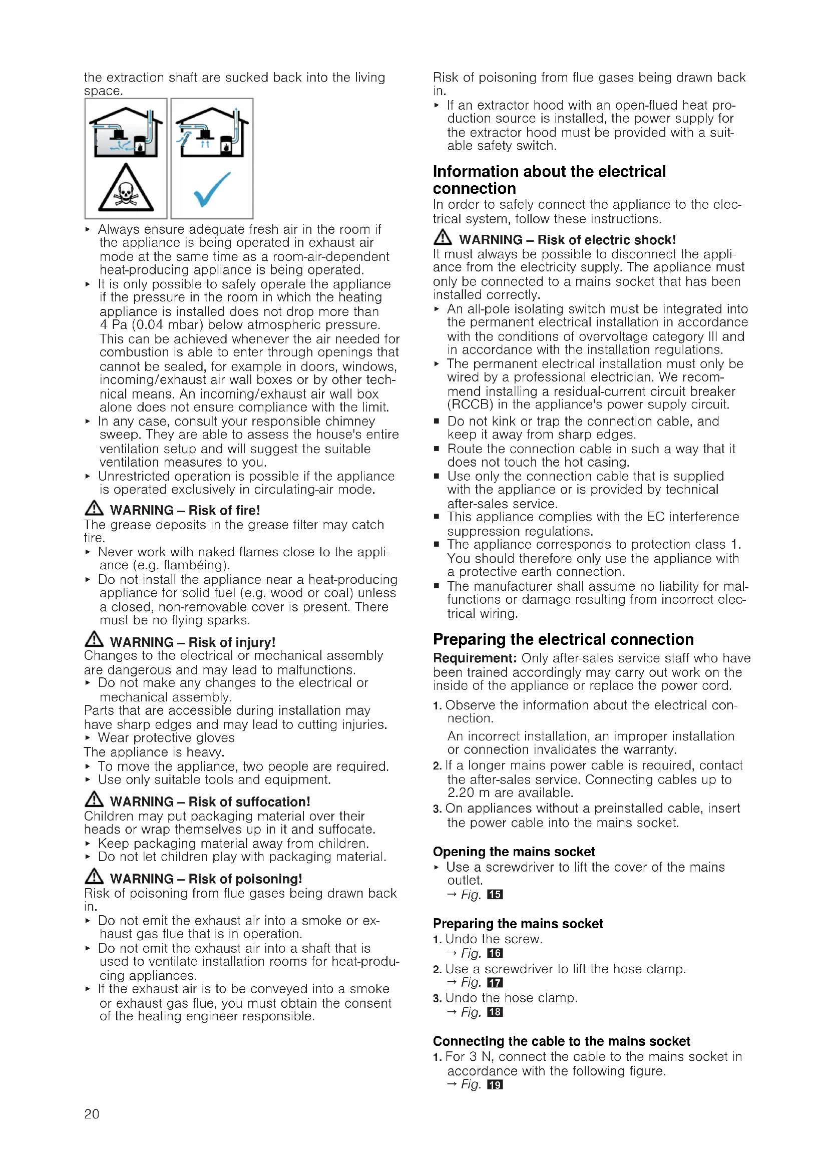 General information ¡ Read this instruction manual carefully. ¡ Only a licensed expert may connect the appliance. ¡ Switch off the power supply before carry- ing out any work. ¡ Never use this appliance in boats or in vehicles. ¡ Follow the worktop manufacturer's recom- mendations. Safe installation Follow these safety instructions when installing the appliance. The appliance can only be used safely if it is cor- rectly installed according to the safety instructions. The installer is responsible for ensuring that the ap- pliance works perfectly at its installation location. WARNING‒Danger: Magnetism! The appliance contains permanent magnets. They may affect electronic implants, e.g. pacemakers or insulin pumps. ▶ Persons with electronic implants must stand at least 10cm away from the appliance. WARNING‒Risk of poisoning! Risk of poisoning from flue gases being drawn back in. Room-air-dependent heat-producing appliances (e.g. gas, oil, wood or coal-operated heaters, con- tinuous flow heaters or water heaters) obtain com- bustion air from the room in which they are installed and discharge the exhaust gases into the open through an exhaust gas system (e.g. a chimney). With the extractor hood switched on, air is extracted from the kitchen and the adjacent rooms. Without an adequate supply of air, the air pressure falls below atmospheric pressure. Toxic gases from the flue or20 the extraction shaft are sucked back into the living space. ▶ Always ensure adequate fresh air in the room if the appliance is being operated in exhaust air mode at the same time as a room-air-dependent heat-producing appliance is being operated. ▶ It is only possible to safely operate the appliance if the pressure in the room in which the heating appliance is installed does not drop more than 4Pa(0.04mbar) below atmospheric pressure. This can be achieved whenever the air needed for combustion is able to enter through openings that cannot be sealed, for example in doors, windows, incoming/exhaust air wall boxes or by other tech- nical means. An incoming/exhaust air wall box alone does not ensure compliance with the limit. ▶ In any case, consult your responsible chimney sweep. They are able to assess the house's entire ventilation setup and will suggest the suitable ventilation measures to you. ▶ Unrestricted operation is possible if the appliance is operated exclusively in circulating-air mode. WARNING‒Risk of fire! The grease deposits in the grease filter may catch fire. ▶ Never work with naked flames close to the appli- ance (e.g. flambéing). ▶ Do not install the appliance near a heat-producing appliance for solid fuel (e.g. wood or coal) unless a closed, non-removable cover is present. There must be no flying sparks. WARNING‒Risk of injury! Changes to the electrical or mechanical assembly are dangerous and may lead to malfunctions. ▶ Do not make any changes to the electrical or mechanical assembly. Parts that are accessible during installation may have sharp edges and may lead to cutting injuries. ▶ Wear protective gloves The appliance is heavy. ▶ To move the appliance, twopeople are required. ▶ Use only suitable tools and equipment. WARNING‒Risk of suffocation! Children may put packaging material over their heads or wrap themselves up in it and suffocate. ▶ Keep packaging material away from children. ▶ Do not let children play with packaging material. WARNING‒Risk of poisoning! Risk of poisoning from flue gases being drawn back in. ▶ Do not emit the exhaust air into a smoke or ex- haust gas flue that is in operation. ▶ Do not emit the exhaust air into a shaft that is used to ventilate installation rooms for heat-produ- cing appliances. ▶ If the exhaust air is to be conveyed into a smoke or exhaust gas flue, you must obtain the consent of the heating engineer responsible. Risk of poisoning from flue gases being drawn back in. ▶ If an extractor hood with an open-flued heat pro- duction source is installed, the power supply for the extractor hood must be provided with a suit- able safety switch. Information about the electrical connection In order to safely connect the appliance to the elec- trical system, follow these instructions. WARNING‒Risk of electric shock! It must always be possible to disconnect the appli- ance from the electricity supply. The appliance must only be connected to a mains socket that has been installed correctly. ▶ An all-pole isolating switch must be integrated into the permanent electrical installation in accordance with the conditions of overvoltage category III and in accordance with the installation regulations. ▶ The permanent electrical installation must only be wired by a professional electrician. We recom- mend installing a residual-current circuit breaker (RCCB) in the appliance's power supply circuit. ¡ Do not kink or trap the connection cable, and keep it away from sharp edges. ¡ Route the connection cable in such a way that it does not touch the hot casing. ¡ Use only the connection cable that is supplied with the appliance or is provided by technical after-sales service. ¡ This appliance complies with the EC interference suppression regulations. ¡ The appliance corresponds to protection class 1. You should therefore only use the appliance with a protective earth connection. ¡ The manufacturer shall assume no liability for mal- functions or damage resulting from incorrect elec- trical wiring. Preparing the electrical connection Requirement:Only after-sales service staff who have been trained accordingly may carry out work on the inside of the appliance or replace the power cord.