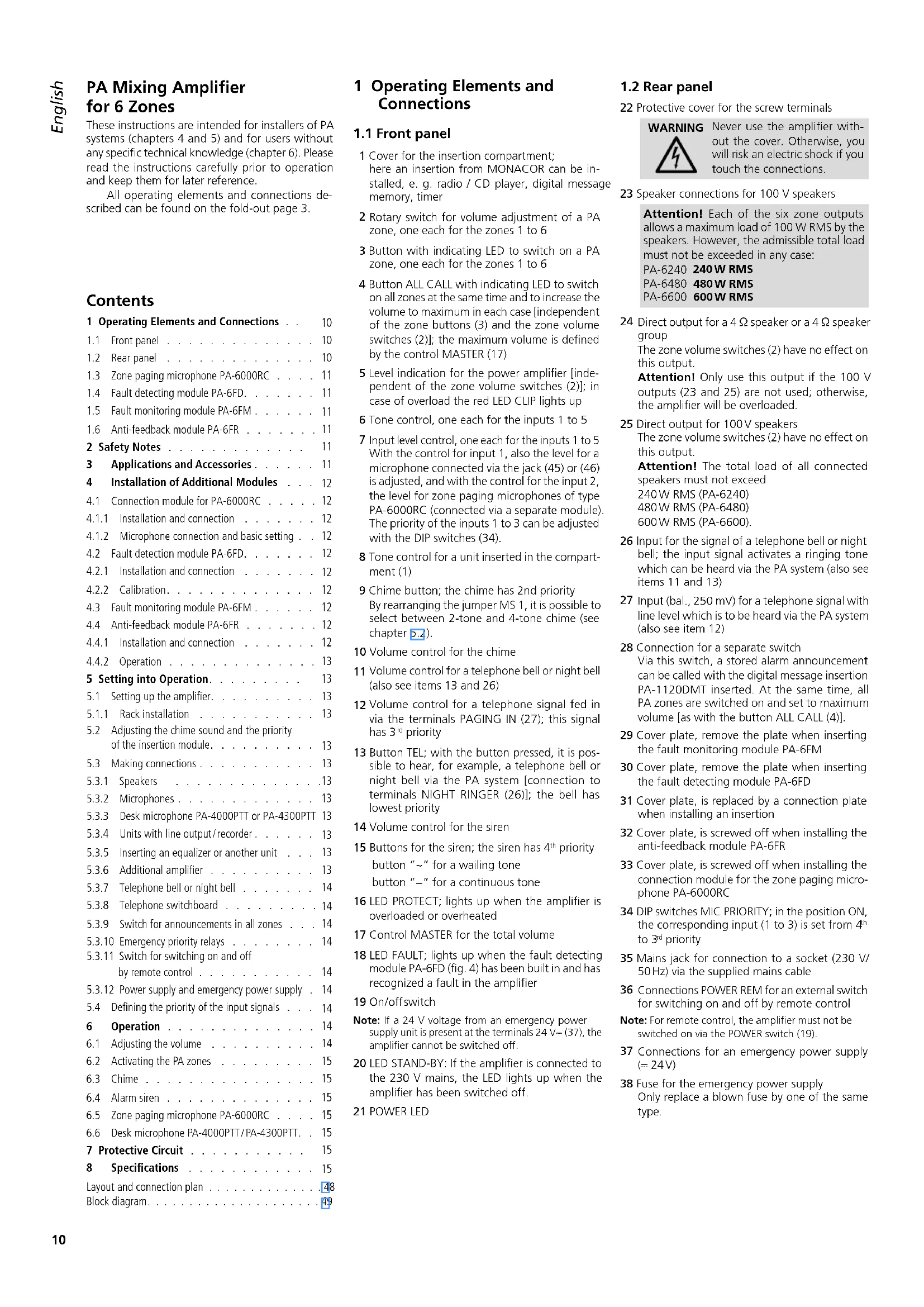 22 Protective cover for the screw terminalsWARNINGNever use the amplifier with-out the cover. Otherwise, you will risk an electric shock if you touch the connections.23 Speaker connections for 100 V speakersAttention! Each of the six zone outputs allows a maximum load of 100 W RMS by the speakers. However, the admissible total load must not be exceeded in any case:PA-6240 240 W RMSPA-6480 480 W RMSPA-6600 600 W RMS Direct output for a 4 Ω speaker or a 4 Ω speaker group The zone volume switches (2) have no effect on this output. Attention! Only use this output if the 100 V outputs (23 and 25) are not used; otherwise, the amplifier will be overloaded.25 Direct output for 100 V speakers The zone volume switches (2) have no effect on this output. Attention! The total load of all connected speakers must not exceed 240 W RMS (PA-6240) 480 W RMS (PA-6480) 600 W RMS (PA-6600).26 Input for the signal of a telephone bell or night bell; the input signal activates a ringing tone which can be heard via the PA system (also see items 11 and 13) Input (bal., 250 mV) for a telephone signal with line level which is to be heard via the PA system (also see item 12)28 Connection for a separate switch Via this switch, a stored alarm announcement can be called with the digital message insertion PA-1120DMT inserted. At the same time, all PA zones are switched on and set to maximum volume [as with the button ALL CALL(4)].29 Cover plate, remove the plate when inserting the fault monitoring module PA-6FM30 Cover plate, remove the plate when inserting the fault detecting module PA-6FD31 Cover plate, is replaced by a connection plate when installing an insertion32 Cover plate, is screwed off when installing the anti-feedback module PA-6FR33 Cover plate, is screwed off when installing the connection module for the zone paging micro-phone PA-6000RC34 DIP switches MIC PRIORITY; in the position ON, the corresponding input (1 to 3) is set from 4