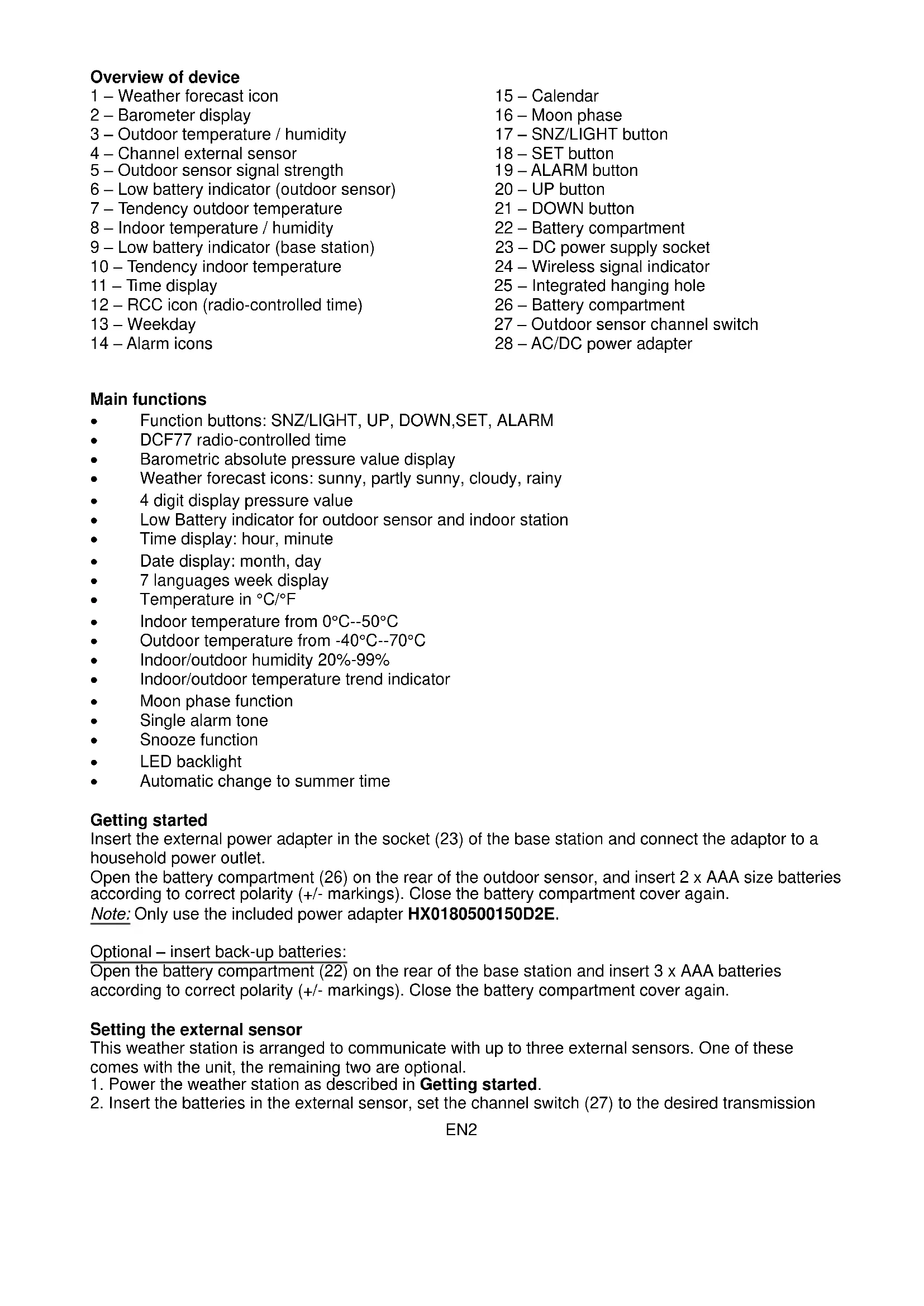 Main functions Function buttons: SNZ/LIGHT, UP, DOWN,SET, ALARM DCF77 radio-controlled time Barometric absolute pressure value display Weather forecast icons: sunny, partly sunny, cloudy, rainy 4 digit display pressure value Low Battery indicator for outdoor sensor and indoor station Time display: hour, minute Date display: month, day 7 languages week display Temperature in °C/°F Indoor temperature from 0°C--50°C Outdoor temperature from -40°C--70°C Indoor/outdoor humidity 20%-99% Indoor/outdoor temperature trend indicator Moon phase function Single alarm tone Snooze function LED backlight Automatic change to summer time Getting started Insert the external power adapter in the socket (23) of the base station and connect the adaptor to a household power outlet. Open the battery compartment (26) on the rear of the outdoor sensor, and insert 2 x AAA size batteries according to correct polarity (+/- markings). Close the battery compartment cover again. Note: Only use the included power adapter HX0180500150D2E. Optional – insert back-up batteries: Open the battery compartment (22) on the rear of the base station and insert 3 x AAA batteries according to correct polarity (+/- markings). Close the battery compartment cover again. Setting the external sensor This weather station is arranged to communicate with up to three external sensors. One of these comes with the unit, the remaining two are optional.