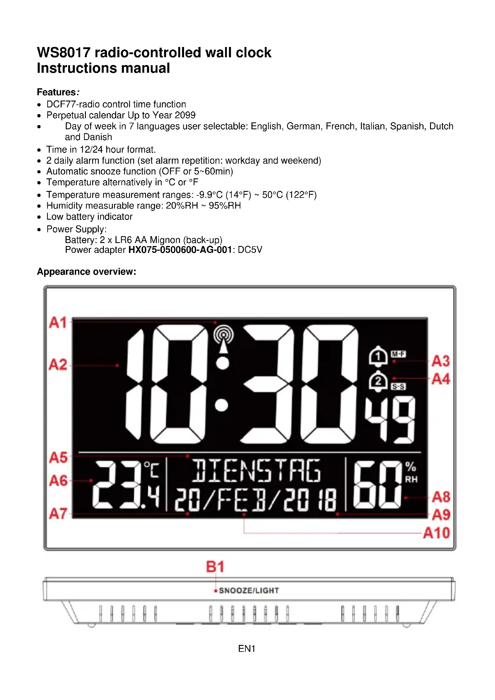 Part A - Positive LCD A1: RCC icon A2: Time A3: Alarm1 icon A4: Alarm2 icon A5: Weekday A6: Temperature A7: Date A8: Humidity A9: Year A10: Month Part B – Buttons and Framework B1: “SNOOZE/LIGHT” touch sensor B2: “SET/ ” button B3: “Alarm” button B4: “UP” button B5: “DOWN” button B6: “°C/°F” button B7: “WAVE” button B8: Hanging hole B9: Support frame B10: Battery compartment B11:Power supply socket Initial operation Use the power adapter to connect the clock with an household power socket. All the icon on the LCD display will briefly light up for 3 seconds, you will hear a beep tone and the clock begins the search for the radio signal. Inserting back-up batteries (optional) Open the battery compartment cover on the backside of the clock. Insert 2 x AA batteries observing correct polarity [ “+” and “-” marks] Close the battery compartment cover again.EN3 Environmental reception effects The clock obtains the accurate time with wireless technology. Same as all wireless devices, the reception is maybe affected by the following circumstances: long transmitting distance nearby mountains and valleys near freeway, railway, airports, high voltage cable etc. near construction site among tall buildings inside concrete buildings near electrical appliances (computers, TV’s, etc) and metallic structures inside moving vehicles Place the clock at a location with optimal signal, i.e. close to a window and away from metal surfaces or electrical appliances. Reception of the radio signal: The clock automatically starts the DCF signal search after 7 minutes of any restart or changing of new fresh batteries. The radio mast icon starts to flash. At 1:00 /2:00 / 3:00 am, the clock automatically carries out the synchronization procedure with the DCF signal to correct any deviations to the exact time. If this synchronization attempt is unsuccessful (the radio mast icon disappears from the display), the system will automatically attempt another synchronization at the next full one hour. This procedure is repeated automatically up to total 5 times. To manually start DCF signal reception, press the “WAVE” button once. If no signals received within 7 minutes, then the DCF signal search stops (the radio mast icon disappears) and start again at the next full one hour. To stop searching radio signal, press the “WAVE” button once. Notes: A flashing radio mast icon indicates that the DCF signal reception has started A continuously displayed radio mast icon indicates that the DCF signal was received successfully We recommend a minimum distance of 2.5 meters to all sources of interference, such as televisions or computer monitors Radio reception is weaker in rooms with concrete walls (e.g.: in cellars) and in offices. In such extreme circumstances, place the system close to the window. During the DCF radio receive mode, only the “WAVE” button function, other button operation have no function, If you want to carry out other functions of operation, please press “WAVE” button to exit the DCF radio receive mode. Selecting RCC mode on/off: Hold the “WAVE” button until the beep tone sounds and “RCC OFF” is shortly displayed on the LCD. The clock is now no longer using radio-controlled function. Hold the “WAVE” button again until the beep tone sounds and “RCC ON” is shortly displayed on the LCD. The clock is using radio-controlled function again. 12-hour or 24-hour time display setting: Press the “DOWN” button to change the time displayed in 12-hour or 24-hour display. Manual time setting: Press and hold down the “SET/ ” button for 2 seconds, the button BEEP sound settings: ON or OFF is displayed. Press the “UP” or “DOWN” button to set BEEP in ON or OFF.EN4 Press “SET/ ” to confirm your setting, the time zone starts to flash. Press the “UP” or “DOWN” button to set a correct time zone (-2 to +2). For example, select "0" for Germany or "- 1" for the United Kingdom. Press “SET/ ” to confirm your setting, the hour display starts to flash. Press the “UP” or “DOWN” button to set the correct hour. Press “SET/ ” to confirm your setting, the minute displays starts to flash. Press the “UP” or “DOWN” button to set the correct minute. Press “SET/ ” to confirm your setting, the year display 2018 starts to flash. Press the “UP” or “DOWN” button to set the correct year. Press “SET/ ” button to confirm your setting, the month display starts to flash. Press the “UP” or “DOWN” button to set the correct month. Press “SET/ ” button to confirm your setting, the date display starts to flash. Press the “UP” or “DOWN” button to set the correct date. Press “SET/ ” button to confirm your setting, the language selection starts to flash. Press the “UP” or “DOWN” button to select a language. Press “SET/ ” to confirm your setting and to end the setting procedures, enter the clock mode. Notes: After 20 seconds without pressing any button, the clock switches automatically from set mode to normal time mode. The value of seconds is automatically reset to 00 if the value of minutes is changed. In the set time, you can hold the “UP” and “DOWN” button to quickly change the setting of the value Explanation of the Time Zone display: If you are in a country in which the clock still receives the DCF signal, but in which the actual local time is different, then you can use the time zone adjustment to adjust your clock to the local time. If, for example, the local time in the country where you are now is in one hour behind of German time, then set the Time zone display to -01. This clock is now DCF controlled, but is showing a time one hour behind. There are 7 languages: English, German, French, Italian, Spanish, Dutch and Danish Week language display Language Sunday Monday Tuesday Wednesday English SUNDAY MONDAY TUESDAY WENDESDAY German SONNTAG MONTAG DIENSTAG MITTWOCH French DIMANCHE LUND