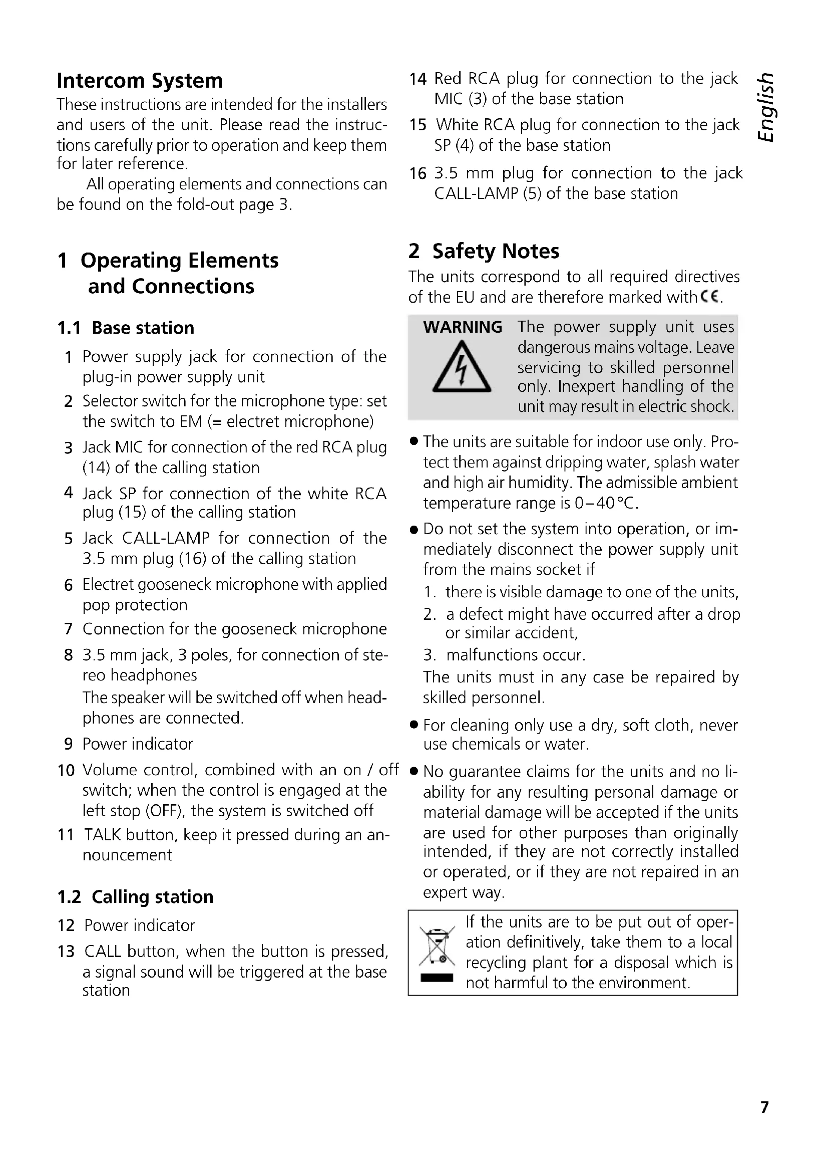 No guarantee claims for the units and no li- ability for any resulting personal damage or material damage will be accepted if the units are used for other purposes than originally intended, if they are not correctly installed or operated, or if they are not repaired in an expert way. If the units are to be put out of oper- ation definitively, take them to a local recycling plant for a disposal which is not harmful to the environment.8 English 3 Applications The cable-connected intercom system ICM-20H is suitable e. g. for reception desks, counters, restaurants, etc. It consists of a base station with integrated amplifier, a calling station, and a plug-in power supply unit for the power supply. Mounting material for fixing the calling station is supplied with the system. The base station has an integrated speaker with volume control, a removable gooseneck microphone, and a talk button. Headphones can be connected to improve intelligibility in noisy environments. The calling station, with integrat- ed speaker and microphone, is connected via three cables to the base station. In addition, it is equipped with a calling button for triggering a signal sound. 4 Mounting the Calling Station