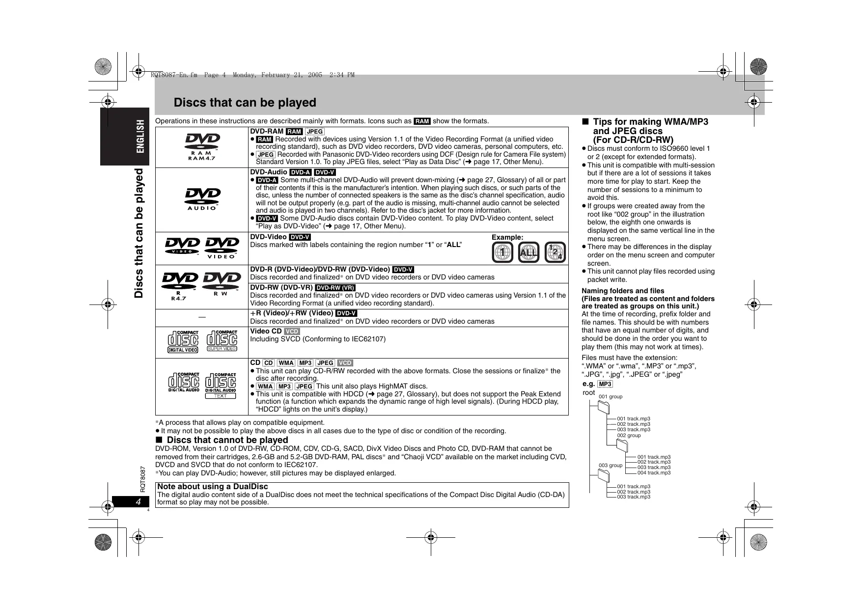 RQT8087-En.fm Page 4 Monday, February 21, 2005 2:34 PM Discs that can be played Discs that can be played Operations in these instructions are described mainly with formats. Icons such as [RAM] show the formats.