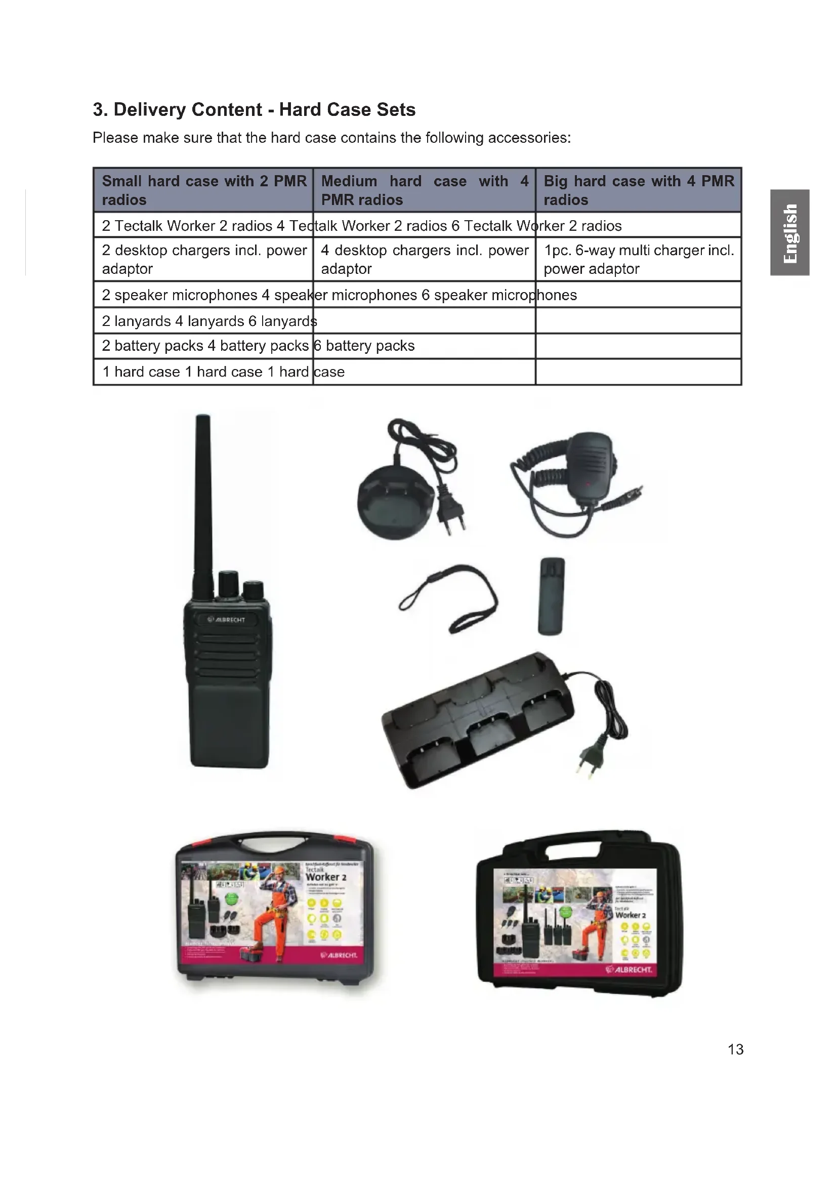 Please make sure that the hard case contains the following accessories: Small hard case with 2 PMR radios Medium hard case with 4 PMR radios Big hard case with 4 PMR radios 2 Tectalk Worker 2 radios 4 Tectalk Worker 2 radios 6 Tectalk Worker 2 radios 2 desktop chargers incl. power adaptor 4 desktop chargers incl. power adaptor 1pc. 6-way multi charger incl. power adaptor 2 speaker microphones 4 speaker microphones 6 speaker microphones 2 lanyards 4 lanyards 6 lanyards 2 battery packs 4 battery packs 6 battery packs 1 hard case 1 hard case 1 hard case14 Englsih
