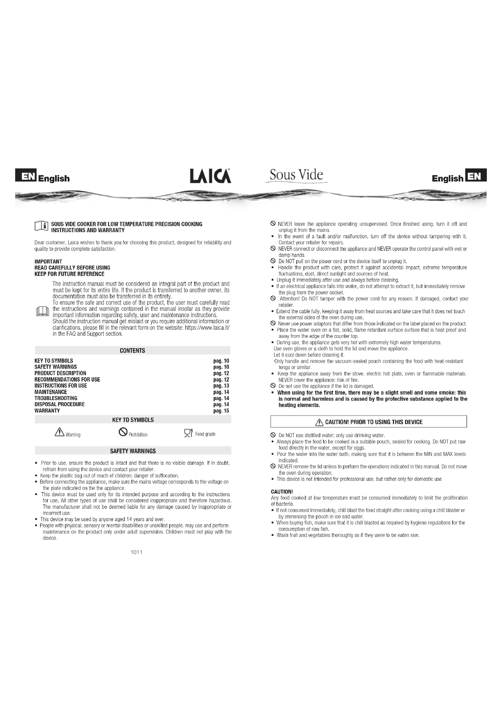 - Store the appliance in a cool, dry area. TROUBLESHOOTING Problem Possible cause Solution The appliance is not working. The appliance is not plugged in. Plug it into the electrical socket. The display shows “E1”. Faulty temperature sensor. The appliance cannot be used. Unplug it and contact your retailer. The display shows “E2” Faulty temperature sensor. The appliance cannot be used. Unplug it and contact your retailer. The appliance switches off automatically, emits five audible beeps and the display shows “E3”. There is no water in the water bath. Make sure the water level in the water bath is between the MIN and MAX levels indicated on the appliance. Top up the appliance with water. The appliance has been topped up with boiling water. Switch off the appliance, empty the water bath and pour in warm water. DISPOSAL PROCEDURE (Dir.2012/19/EU-WEEE) The symbol on the base of the appliance recommends the separate collection of electrical and electronic equipment. At the end of the useful life of the appliance, do not dispose of it as mixed solid municipal waste but dispose of it at a specific collection centre located in your area or return it to the distributor at the time of purchasing a new appliance of the same type and intended for the same functions. Where the size of the appliance to be disposed of is less than 25 cm, it is possible to return it to a point of sale with length greater than 400 square meters without the requirement to purchase a new similar appliance. This procedure of separate collection of electrical and electronic equipment is carried out within the context of a Community environmental policy with the aim of preserving, protecting and improving the quality of the environment and to avoid potential effects to human health due to the presence of hazardous substances contained in these appliances or to misuse of the same or parts of them. Attention! The improper disposal of electrical and electronic equipment may result in penalties. This product is meant for domestic use. The conformity, certified by the CE-marking on the device, refers to the Directive 2014/30/Eu on electromagnetic compatibility, to the Directive 2014/35/Eu on electric material destined to be used within given voltage limits and on Directive 2011/65/Eu on the restriction of the use of certain hazardous substances in electrical and electronic equipment. This product is an electronic device that was tested to assure, according to the current technical knowledge, that it does not interfere with other nearby located equipment (electromagnetic compatibility) and that it is safe if used according to the advices given in the instructions for use. In case of operation anomalies, do not keep using the device and, if necessary, refer to the manufacturer directly. WARRANTY This appliance is guaranteed for 2 years from the time of delivery of the goods, or another longer term envisaged by the national legislation of the consumer's residence. This provision complies with Italian and European legislation. The Laica products are designed for home use and must not be used in public venues. The warranty only covers manufacturing defects and does not apply if the damage is caused by an accidental event, incorrect use, negligence or misuse of the product. Use only the accessories supplied; the use of different accessories may result in invalidity of the warranty. Do not open the unit for any reason; in the case of opening or tampering, the warranty is definitively voided. This warranty does not apply to parts subject to wear or to the batteries when supplied. After 2 years from delivery, or another longer term envisaged by the national legislation of the consumer's residence, the warranty expires; in this case, the technical assistance interventions will be carried out against a fee. Information on technical assistance, whether under warranty or for a fee, can be requested by contacting info@laica.com. No payment will be due for repairs or replacements of products that fall within the terms of the warranty. In the event of faults, contact the retailer. Do NOT send the appliance directly to LAICA. All the operations under warranty (including those of replacement of the product or part thereof) will not prolong the duration of the original period of warranty of the product replaced. The manufacturer declines any liability for any damage that may, directly or indirectly, be caused to persons, property or animals as a result of the non-observance of all the requirements established in the relevant instructions manual and concerning, especially, warnings relating to installation, use and maintenance of the appliance. Laica, in its constant commitment to improving its products, is entitled to changing without any notice, in whole or in part, its products in relation to production requirements, without this entailing any liability for Laica towards its dealers. For further information: www.laica.it. EN EN English English16 17 HORNO DE AGUA PARA LA COCCIÓN AL VACÍO A BAJA TEMPERATURA –