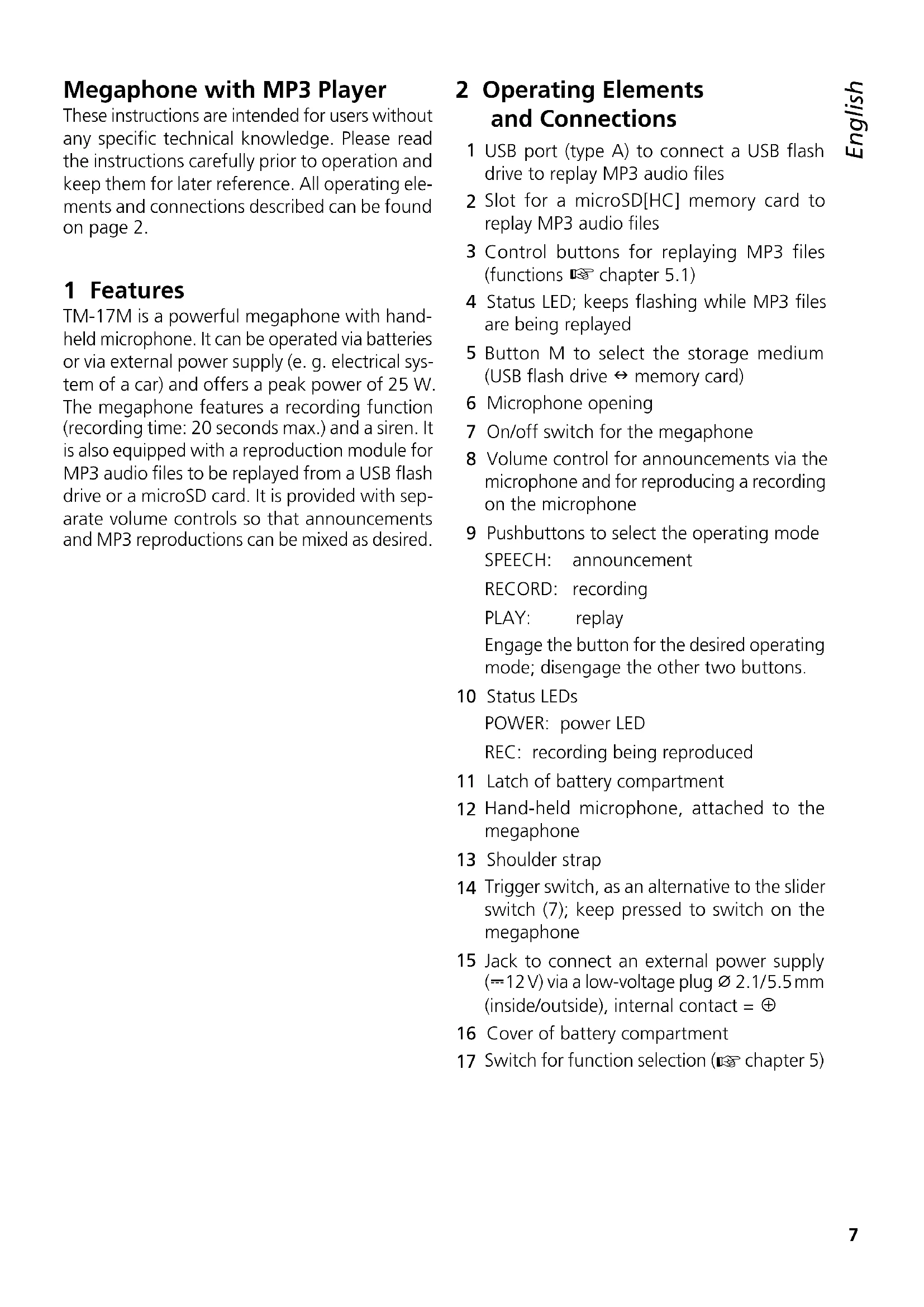 INTERNATIONAL GmbH & Co. KG geschützt. Eine Reproduktion für eigene kommerzielle Zwecke – auch auszugsweise – ist untersagt.7 English Referenz für Sprachkennzeichnung der Seiten und Inhaltsverzeichnis Referenz für Sprachen-Inhaltsverzeichnis English English Page Megaphone with MP3 Player These instructions are intended for users without any specific technical knowledge. Please read the instructions carefully prior to operation and keep them for later reference. All operating ele- ments and connections described can be found on page 2. 1 Features TM-17M is a powerful megaphone with hand- held microphone. It can be operated via batteries or via external power supply (e. g. electrical sys- tem of a car) and offers a peak power of 25 W. The megaphone features a recording function (recording time: 20 seconds max.) and a siren. It is also equipped with a reproduction module for MP3 audio files to be replayed from a USB flash drive or a microSD card. It is provided with sep- arate volume controls so that announcements and MP3 reproductions can be mixed as desired. 2 Operating Elements andConnections