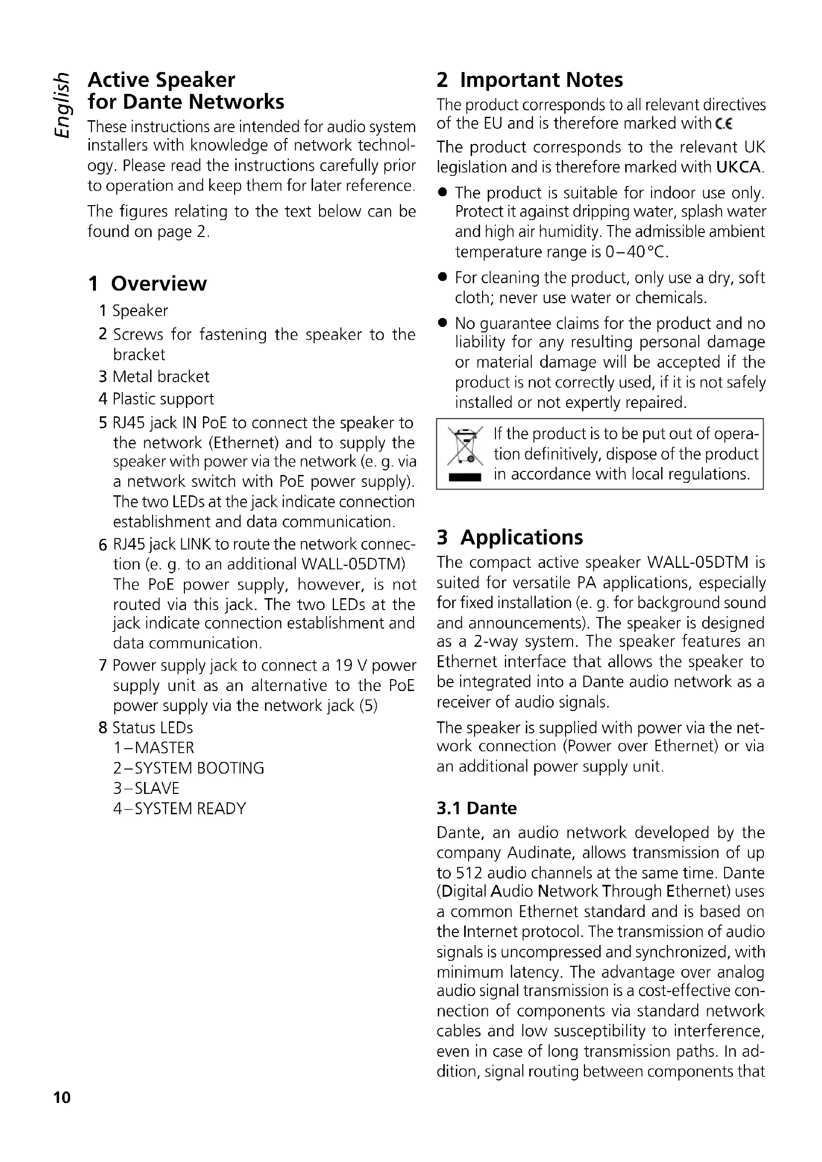 No guarantee claims for the product and no liability for any resulting personal damage or material damage will be accepted if the product is not correctly used, if it is not safely installed or not expertly repaired. If the product is to be put out of opera- tion definitively, dispose of the product in accordance with local regulations. 3 Applications The compact active speaker WALL-05DTM is suited for versatile PA applications, especially for fixed installation (e. g. for background sound and announcements). The speaker is designed as a 2-way system. The speaker features an Ethernet interface that allows the speaker to be integrated into a Dante audio network as a receiver of audio signals. The speaker is supplied with power via the net- work connection (Power over Ethernet) or via an additional power supply unit.