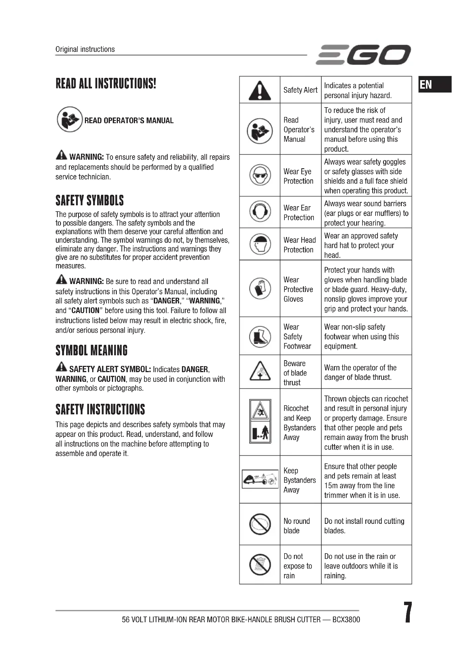 safety instructions in this Operator’s Manual, including all safety alert symbols such as “DANGER,” “WARNING,” and “CAUTION” before using this tool. Failure to follow all instructions listed below may result in electric shock, fire, and/or serious personal injury. SYMBOL MEANING SAFETY ALERT SYMBOL: Indicates DANGER, WARNING, or CAUTION, may be used in conjunction with other symbols or pictographs. SAFETY INSTRUCTIONS This page depicts and describes safety symbols that may appear on this product. Read, understand, and follow all instructions on the machine before attempting to assemble and operate it. Safety Alert Indicates a potential personal injury hazard. Read Operator’s Manual To reduce the risk of injury, user must read and understand the operator’s manual before using this product. Wear Eye Protection Always wear safety goggles or safety glasses with side shields and a full face shield when operating this product. Wear Ear Protection Always wear sound barriers (ear plugs or ear mufflers) to protect your hearing. Wear Head Protection Wear an approved safety hard hat to protect your head. Wear Protective Gloves Protect your hands with gloves when handling blade or blade guard. Heavy-duty, nonslip gloves improve your grip and protect your hands. Wear Safety Footwear Wear non-slip safety footwear when using this equipment. Beware of blade thrust Warn the operator of the danger of blade thrust. Ricochet and Keep Bystanders Away Thrown objects can ricochet and result in personal injury or property damage. Ensure that other people and pets remain away from the brush cutter when it is in use. 15m Keep Bystanders Away Ensure that other people and pets remain at least 15m away from the line trimmer when it is in use. No round blade Do not install round cutting blades. Do not expose to rain Do not use in the rain or leave outdoors while it is raining. Original instructions56 VOLT LITHIUM-ION REAR MOTOR BIKE-HANDLE BRUSH CUTTER — BCX38008