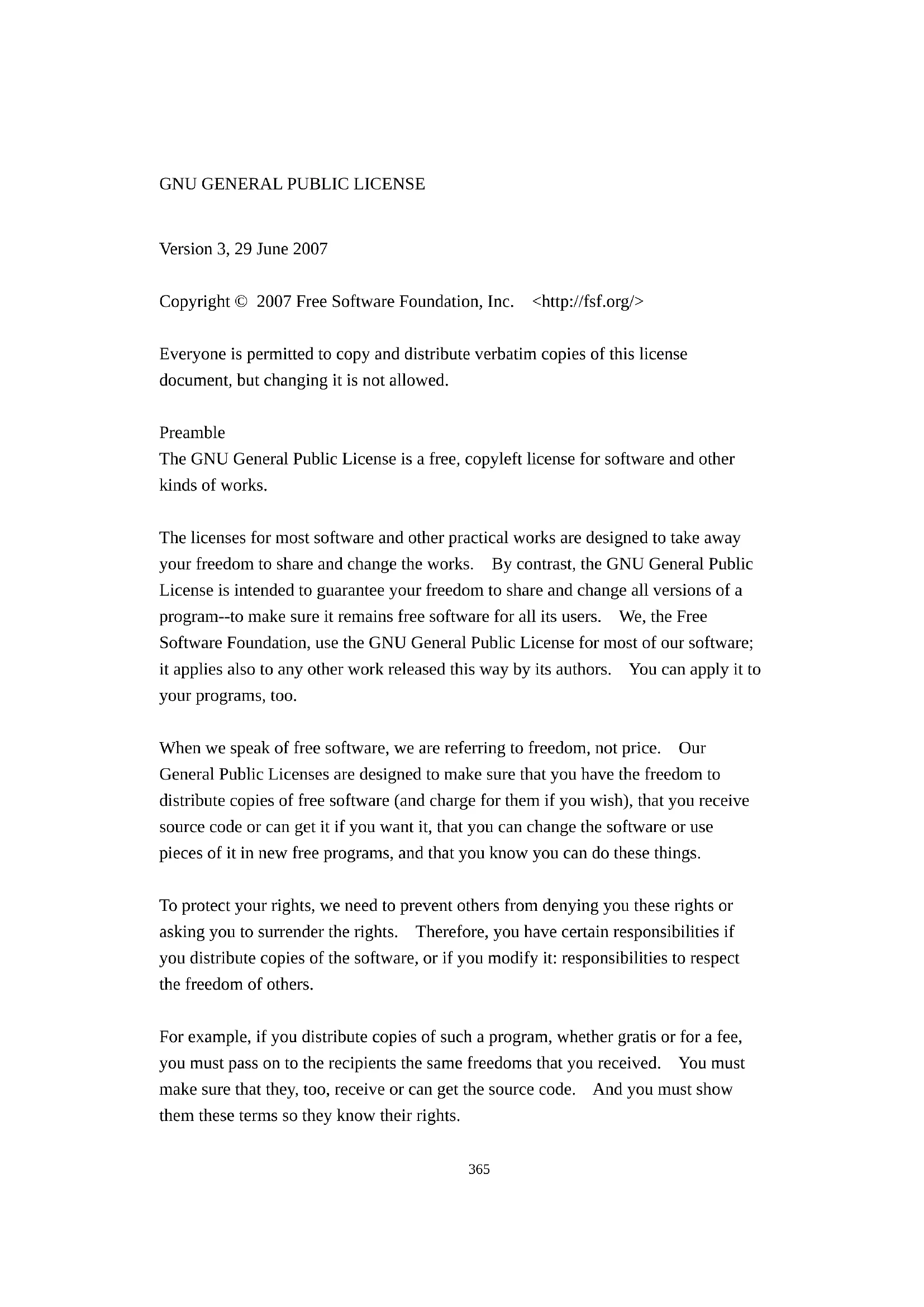 Version 3, 29 June 2007 Copyright © 2007 Free Software Foundation, Inc. <http://fsf.org/> Everyone is permitted to copy and distribute verbatim copies of this license document, but changing it is not allowed. Preamble The GNU General Public License is a free, copyleft license for software and other kinds of works. The licenses for most software and other practical works are designed to take away your freedom to share and change the works. By contrast, the GNU General Public License is intended to guarantee your freedom to share and change all versions of a program--to make sure it remains free software for all its users. We, the Free Software Foundation, use the GNU General Public License for most of our software; it applies also to any other work released this way by its authors. You can apply it to your programs, too. When we speak of free software, we are referring to freedom, not price. Our General Public Licenses are designed to make sure that you have the freedom to distribute copies of free software (and charge for them if you wish), that you receive source code or can get it if you want it, that you can change the software or use pieces of it in new free programs, and that you know you can do these things. To protect your rights, we need to prevent others from denying you these rights or asking you to surrender the rights. Therefore, you have certain responsibilities if you distribute copies of the software, or if you modify it: responsibilities to respect the freedom of others. For example, if you distribute copies of such a program, whether gratis or for a fee, you must pass on to the recipients the same freedoms that you received. You must make sure that they, too, receive or can get the source code. And you must show them these terms so they know their rights.366 Developers that use the GNU GPL protect your rights with two steps: (1) assert copyright on the software, and (2) offer you this License giving you legal permission to copy, distribute and/or modify it. For the developers' and authors' protection, the GPL clearly explains that there is no warranty for this free software. For both users' and authors' sake, the GPL requires that modified versions be marked as changed, so that their problems will not be attributed erroneously to authors of previous versions. Some devices are designed to deny users access to install or run modified versions of the software inside them, although the manufacturer can do so. This is fundamentally incompatible with the aim of protecting users' freedom to change the software. The systematic pattern of such abuse occurs in the area of products for individuals to use, which is precisely where it is most unacceptable. Therefore, we have designed this version of the GPL to prohibit the practice for those products. If such problems arise substantially in other domains, we stand ready to extend this provision to those domains in future versions of the GPL, as needed to protect the freedom of users. Finally, every program is threatened constantly by software patents. States should not allow patents to restrict development and use of software on general-purpose computers, but in those that do, we wish to avoid the special danger that patents applied to a free program could make it effectively proprietary. To prevent this, the GPL assures that patents cannot be used to render the program non-free. The precise terms and conditions for copying, distribution and modification follow.