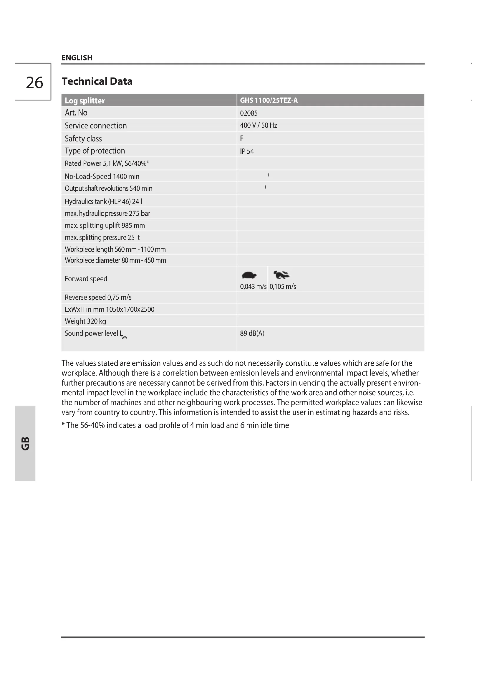 The values stated are emission values and as such do not necessarily constitute values which are safe for the workplace. Although there is a correlation between emission levels and environmental impact levels, whether further precautions are necessary cannot be derived from this. Factors in uencing the actually present environmental impact level in the workplace include the characteristics of the work area and other noise sources, i.e. the number of machines and other neighbouring work processes. The permitted workplace values can likewise vary from country to country. This information is intended to assist the user in estimating hazards and risks.