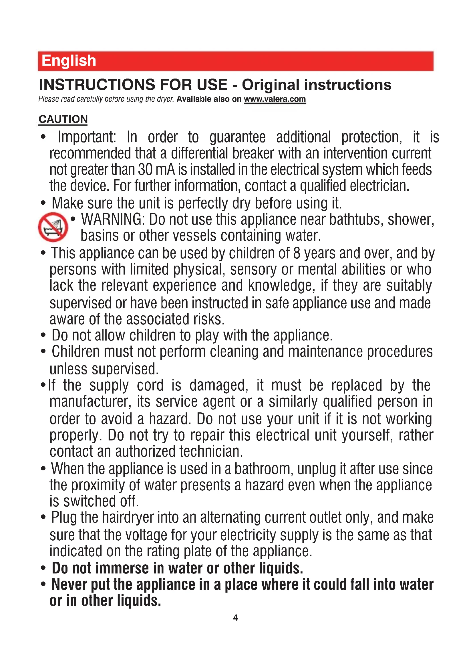 - Designa HAND-H INSTRUCTIONS FOR USE - Original instructions Please read carefully before using the dryer. Available also on www.valera.com CAUTION