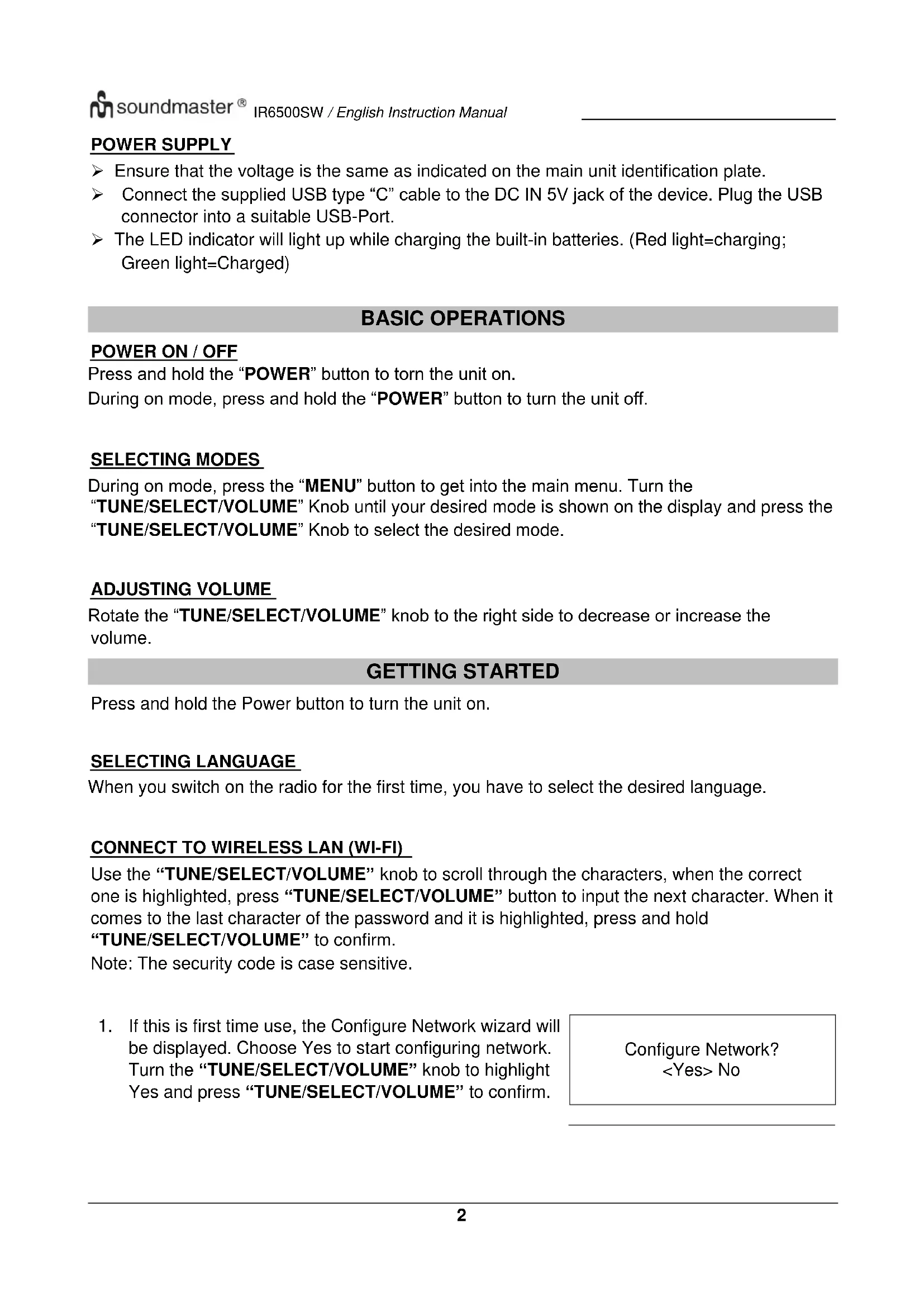 Press and hold the “POWER” button to torn the unit on. During on mode, press and hold the “POWER” button to turn the unit off. SELECTING MODES During on mode, press the “MENU” button to get into the main menu. Turn the “TUNE/SELECT/VOLUME” Knob until your desired mode is shown on the display and press the “TUNE/SELECT/VOLUME” Knob to select the desired mode. ADJUSTING VOLUME Rotate the “TUNE/SELECT/VOLUME” knob to the right side to decrease or increase the volume. GETTING STARTED Press and hold the Power button to turn the unit on. SELECTING LANGUAGE When you switch on the radio for the first time, you have to select the desired language. CONNECT TO WIRELESS LAN (WI-FI) Use the “TUNE/SELECT/VOLUME” knob to scroll through the characters, when the correct one is highlighted, press “TUNE/SELECT/VOLUME” button to input the next character. When it comes to the last character of the password and it is highlighted, press and hold “TUNE/SELECT/VOLUME” to confirm. Note: The security code is case sensitive.