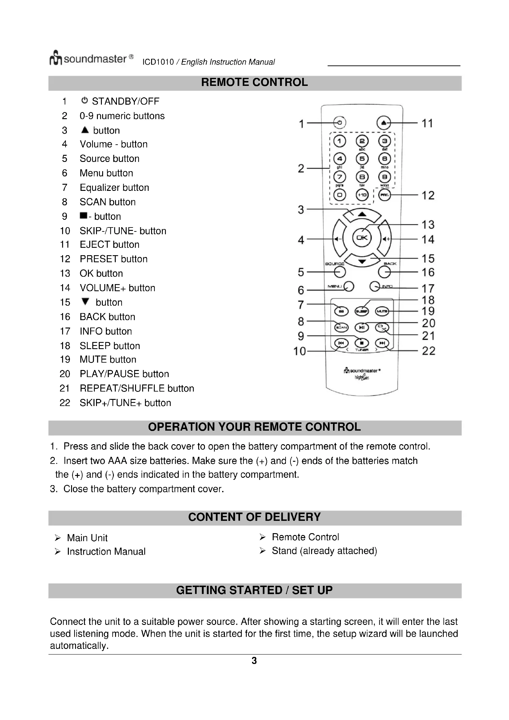 Download the instructions for your Hi-fi system in PDF format for free! Find your manual ICD1010 - Soundmaster and take your electronic device back in hand. On this page are published all the documents necessary for the use of your device. ICD1010 by Soundmaster.