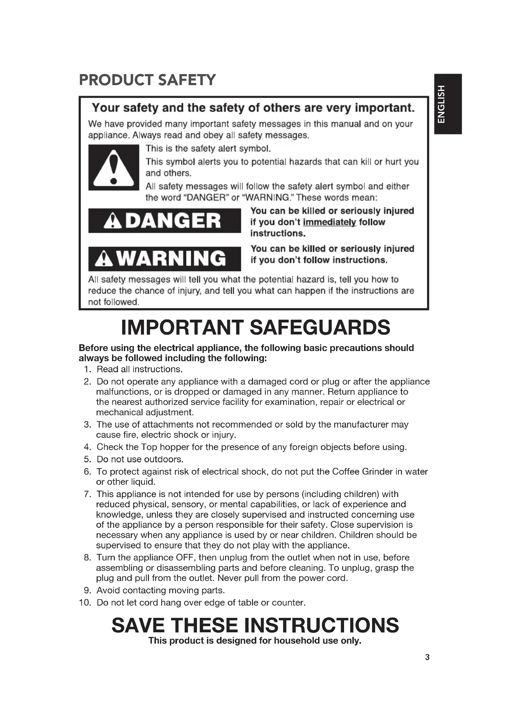 This product is designed for household use only.4 PRODUCT SAFETY ELECTRICAL REQUIREMENTS Voltage: 120 VAC Frequency: 60 Hz Wattage: 150 Watts NOTE: This appliance has a polarized plug (one blade is wider than the other). To reduce the risk of electric shock, this plug will t in a polarized outlet only one way. If the plug does not t fully in the outlet, reverse the plug. If it still does not t, contact a qualied electrician. Do not modify the plug in any way. Do not use an adapter. Do not use an extension cord. If the power supply cord is too short, have a qualied electrician or service person to install an outlet near the appliance. The cord should be arranged so that it will not drape over the countertop or tabletop where it can be pulled on by children or tripped over unintentionally. PRODUCT OVERVIEW Your Burr Grinder has 70 unique grind size settings that are suitable for a range of brewing methods, from the nest setting for espresso to the coarsest setting for french press. By adjusting the Dose selection knob, you can choose from 1 to 2 shots of espresso or 1 to 12 cups of coffee.