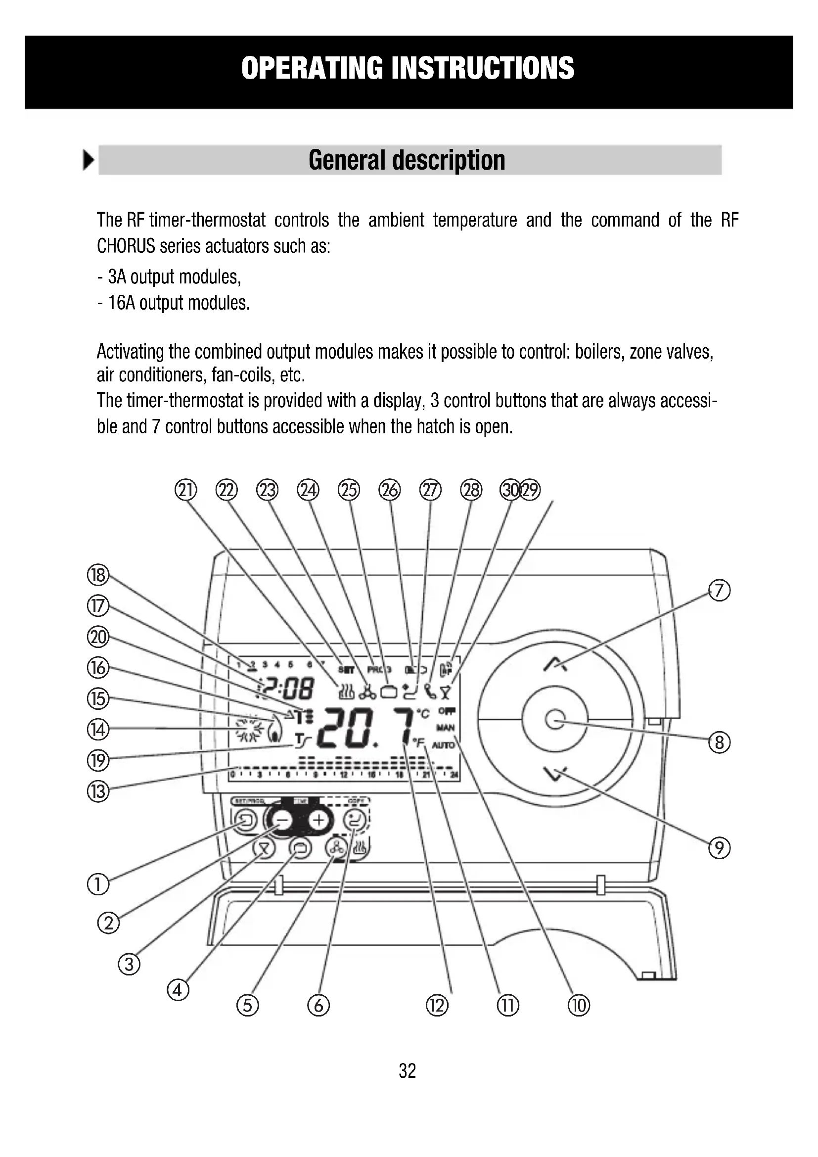 General description The RF timer-thermostat controls the ambient temperature and the command of the RF CHORUS series actuators such as: - 3A output modules, - 16A output modules. Activating the combined output modules makes it possible to control: boilers, zone valves, air conditioners, fan-coils, etc. The timer-thermostat is provided with a display, 3 control buttons that are always accessi- ble and 7 control buttons accessible when the hatch is open.
