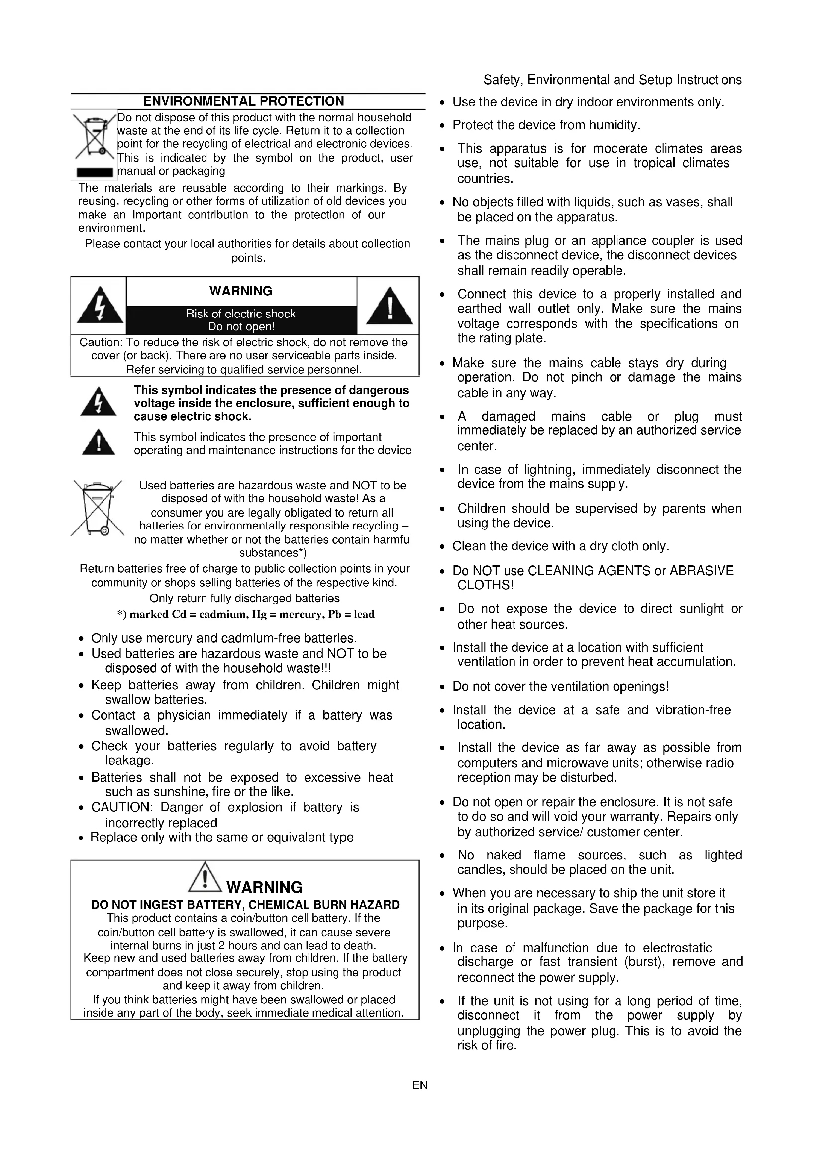 Only use mercury and cadmium-free batteries. Used batteries are hazardous waste and NOT to be disposed of with the household waste!!! Keep batteries away from children. Children might swallow batteries. Contact a physician immediately if a battery was swallowed. Check your batteries regularly to avoid battery leakage. Batteries shall not be exposed to excessive heat such as sunshine, fire or the like. CAUTION: Danger of explosion if battery is incorrectly replaced Replace only with the same or equivalent type