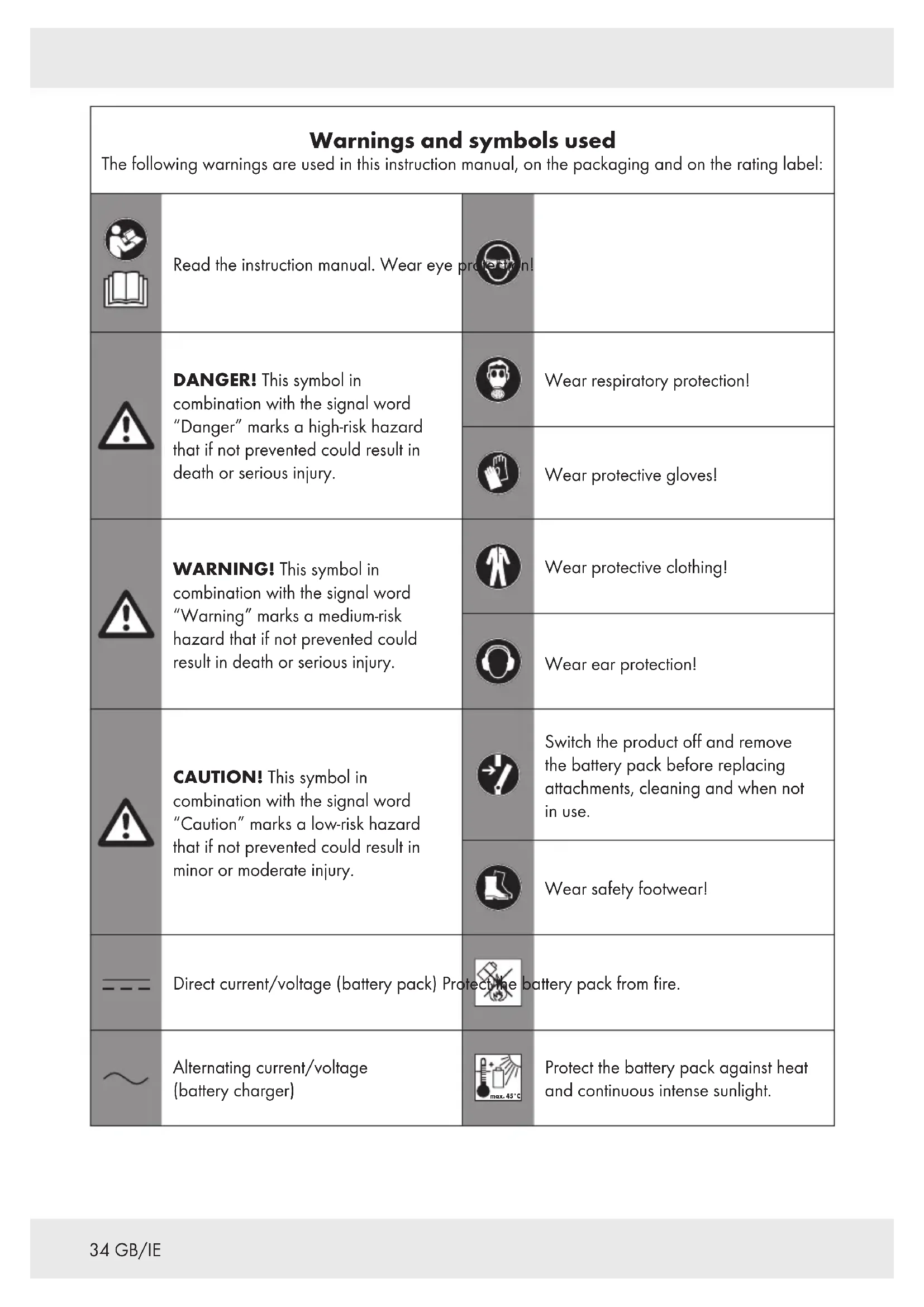 packs. Service of battery packs should be only be performed by the manufactured or authorized service providers.42 GB/IE Backpack sprayer safety warnings The backpack sprayer shall be used only with plant protection products approved by local/national regulatory authorities for plant protection products for use with knapsack sprayers. Keep the area clear of all bystanders, children and pets while spraying. Be aware of any hazards presented by the spray materials. Before using any pesticide or other spray materials with the product, carefully read the label on the original container and follow instructions. Risk of fire! Do not spray flammable liquids such as gasoline. Risk of explosion! Do not place in direct sunlight. Only use the parts supplied or approved by the manufacturer. Do not spray into wind, water or drinking water source. Properly tighten the spray tank cover after pouring liquids into the spray tank. Use only consumer-grade water-based chemicals. Do not use alkali self-heating or corrosive liquids with the product. These can corrode metal parts or weaken the tank and hose. Do not leave residue or spray material in the spray tank after using the product. Clean the product after each use. Do not add liquids with a temperature of more than 45 °C to avoid damaging the hose or spray tank. Do not overfill the tank. Do not operate the product in narrow or enclosed spaces. Always spray in a well- ventilated area Do not smoke, eat or drink while using the product. Do not smoke in areas where the product is used. Always wear appropriate personal protection equipment. Do not discharge the spray materials directly against skin. Aim the nozzle directly at the plants or objects intend to spray. Ensure that the spray materials are directed at an area that will not be damaged by the spray materials. Electric shock hazard! Do not spray towards electric outlets. After every use, thoroughly wash your hands and any area where skin has been exposed to the spray materials. Remove the battery pack from the product before draining, cleaning or storing the product to avoid accidental starting. Thoroughly inspect both the inside and outside of the product and examine all components before each use. Check for cracked and deteriorated hoses, leaks, clogged nozzles, and missing or damaged parts. A damaged hose or loose hose connection can result in accidental contact with the spray solution, causing serious injury or property damage. If damaged, have the product repaired before use. Many accidents are caused by poorly maintained products. Do not lift or carry the product by the hose or shut-off valve. Carry the product by the handle and the shoulder strap only.43GB/IE Never use the product in a room where there is a danger of explosion or in the vicinity of flammable liquids or gases. Do not immerse the product in water or other liquids. Do not place the product where it can fall or be pulled into a tub or sink. Only operate the product when it is in an upright position. Do not operate the product with an empty spray tank. It is necessary to provide the appropriate training in safe operation. Do not use the product while tired, ill or under the influence of alcohol, drugs or medicaments. Always carry out a visual inspection before using the product. Do not use the product if it is damaged. If the product is damaged, have it checked by qualified personnel. Always check the product for leaks. If any are found, correct them before using the product. When assembling or removing accessories, do not point them towards yourself or other persons. The product must only be operated by 1 person at a time. Nobody else must be within a radius of 15 metres at the same time. If there is no spray coming out from the nozzle or the spray amount is decreased, the hose and spray system may be blocked. Rinse and clean all parts of the hose and spray system (shut-off valve, small filter, nozzle pipe, hose, nozzle) with clean water. After the product has been stored for a long time (e.g. during winter), fill the spray tank [2] with clean water. Carry out a test run to check if there are any leakages or cracks. Release the residual pressure in the spray tank after each use and especially before removing the spray tank cover. Do so by pressing the trigger. Do not modify the product under any circumstance. Modifications may result in serious injury. All servicing and maintenance, other than the items listed in this instruction manual, should be performed by an authorised service centre. Only use spare parts and accessories provided by the manufacturer. All other repairs shall only be carried out by an authorised service centre. Improper maintenance, use of non-conforming components and removal of safety devices can lead to a hazardous situation, such as death, life-threatening injuries and damage. Vibration and noise reduction To reduce the impact of noise and vibration emission, limit the time of operation, use low- vibration and low-noise operating modes and wear personal protective equipment. Take the following points into account to minimise the vibration and noise exposure risks: Only use the product as intended by its design and these instructions. Ensure that the product is in good condition and well maintained. Keep tight grip on the handles/grip surface.44 GB/IE Maintain this product in accordance with these instructions and keep it well lubricated (where appropriate). Plan your work schedule to spread any high vibration tool use across a longer period of time. Behaviour in emergency situations Familiarise yourself with the use of this product by means of this instruction manual. Memorise the safety warnings and follow them to the letter. This will help to prevent risks and hazards. Always be alert when using this product, so that you can recognise and handle risks early. Fast intervention can prevent serious injury and damage to property. Switch the product off and remove the battery pack if there are malfunctions. Ha