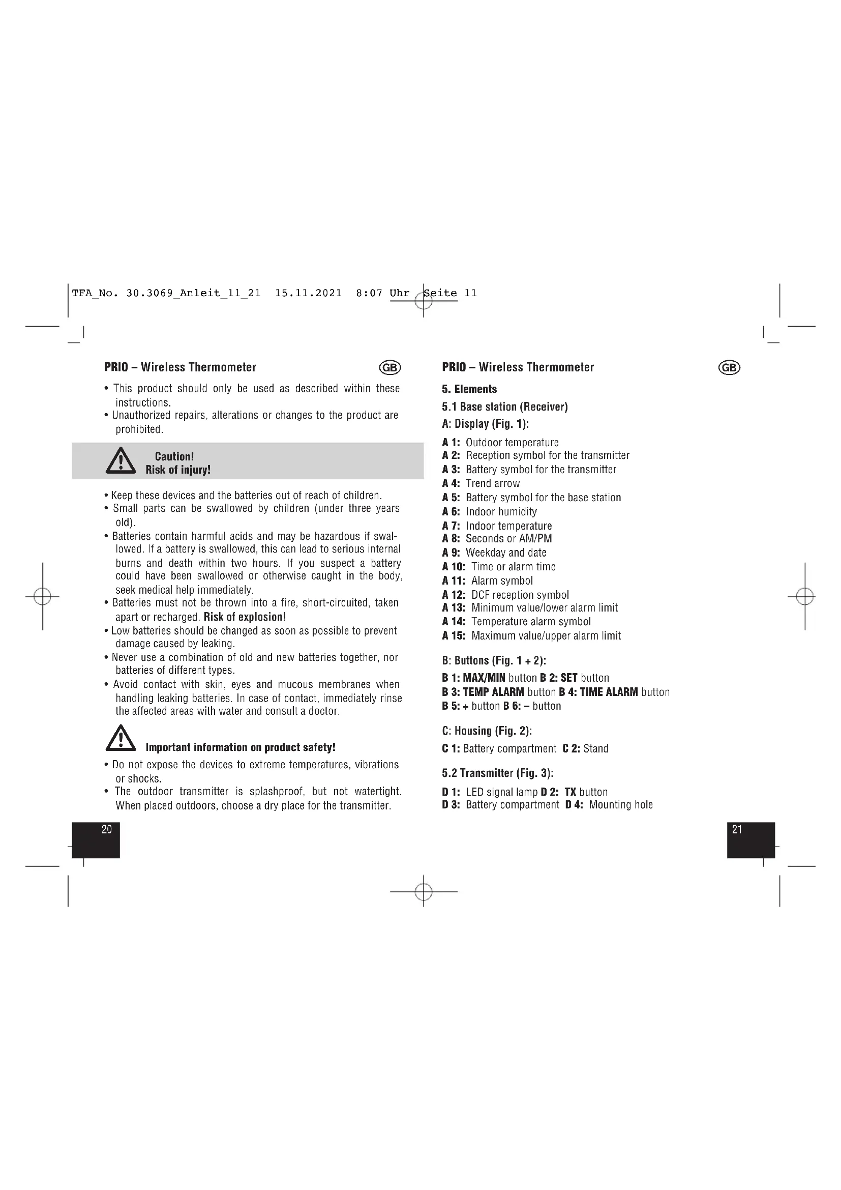 A: Display (Fig. 1): A 1: Outdoor temperature A 2: Reception symbol for the transmitter A 3: Battery symbol for the transmitter A 4: Trend arrow A 5: Battery symbol for the base station A 6: Indoor humidity A 7: Indoor temperature A 8: Seconds or AM/PM A 9: Weekday and date A 10: Time or alarm time A 11: Alarm symbol A 12: DCF reception symbol A 13: Minimum value/lower alarm limit A 14: Temperature alarm symbol A 15: Maximum value/upper alarm limit B: Buttons (Fig. 1 + 2): B 1: MAX/MIN button B 2: SET button B 3: TEMP ALARM button B 4: TIME ALARM button B 5: + button B 6: – button C: Housing (Fig. 2): C 1: Battery compartment C 2: Stand