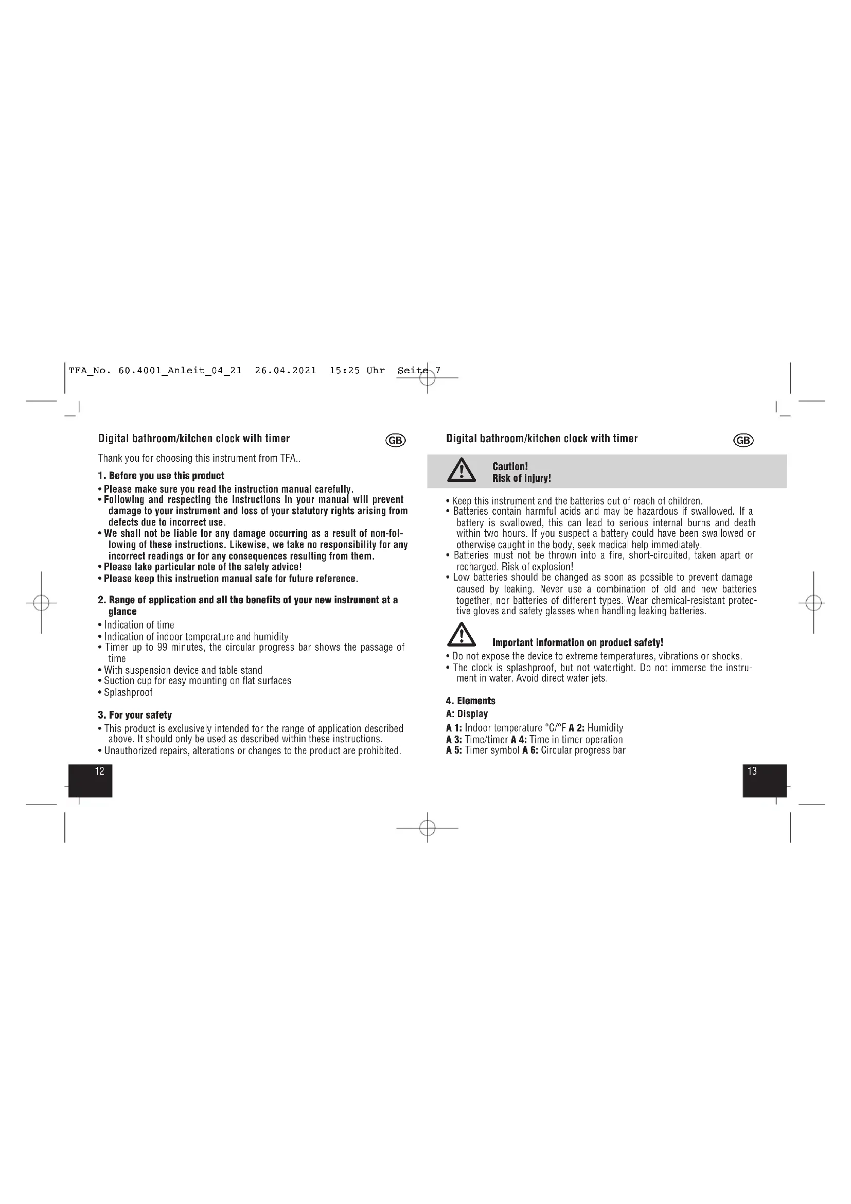 No part of this manual may be reproduced without written consent of TFA Dostmann. The technical data are correct at the time of going to print and may change without prior notice. The latest technical data and information about this product can be found in our home- page by simply entering the product number in the search box. www.tfa-dostmann.de E-Mail: info@tfa-dostmann.de TFA Dostmann GmbH & Co.KG, Zum Ottersberg 12, D-97877 Wertheim, Germany 04/21 Horloge digitale de salle de bains/cuisine avec minuteur
