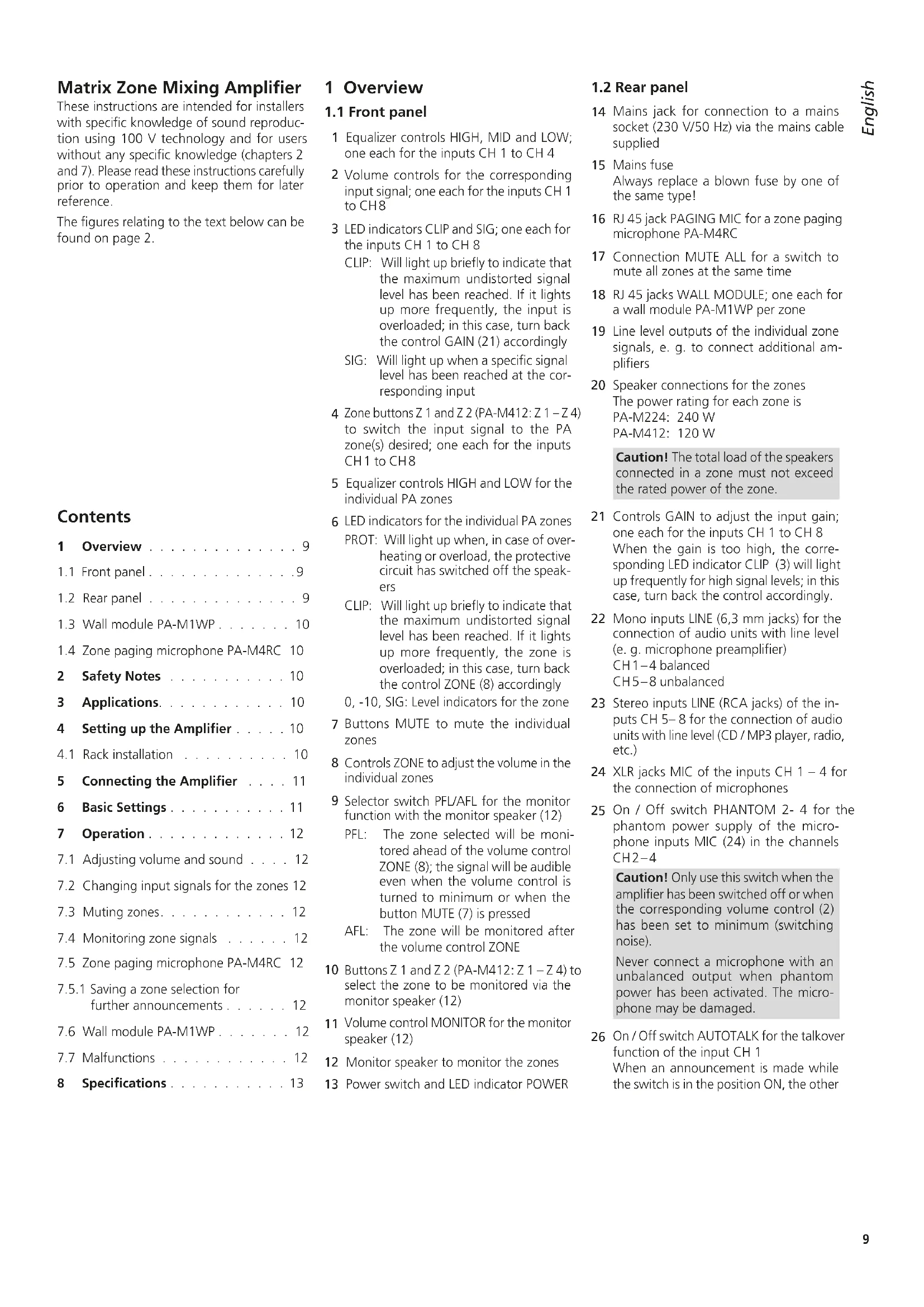If the amplifier stage of a zone is overheated or overloaded, the protective circuit will inter- rupt the signal path to the speaker terminal SPEAKER (20) in this zone. In this case, no signal will be audible in the zone and the corresponding LED indicator PROT (6) will light up. Use the corresponding control ZONE (8) to reduce the zone volume. If the LED indica- tor PROT fails to extinguish after the amplifier stage has cooled down, ask skilled personnel to find and eliminate the fault.13 English 8 Specifications Amplifier PA-M224 PA-M412 Number of input channels 8 8 Number of zones 2 4 Rated output power 2 × 240 W 4 × 120 W THD < 1 % < 1 % Zone outputs Connection 2 × speaker 100 V 2 × line signal Screw terminals 4 × speaker 100 V 4 × line signal Screw terminals Phantom power supply for Mic CH 1 – 4 24 V 24 V Inputs Mic CH 1 – 4 Line CH 1 – 4 Line CH 5 – 8 Input sensitivity/ Impedance; connection