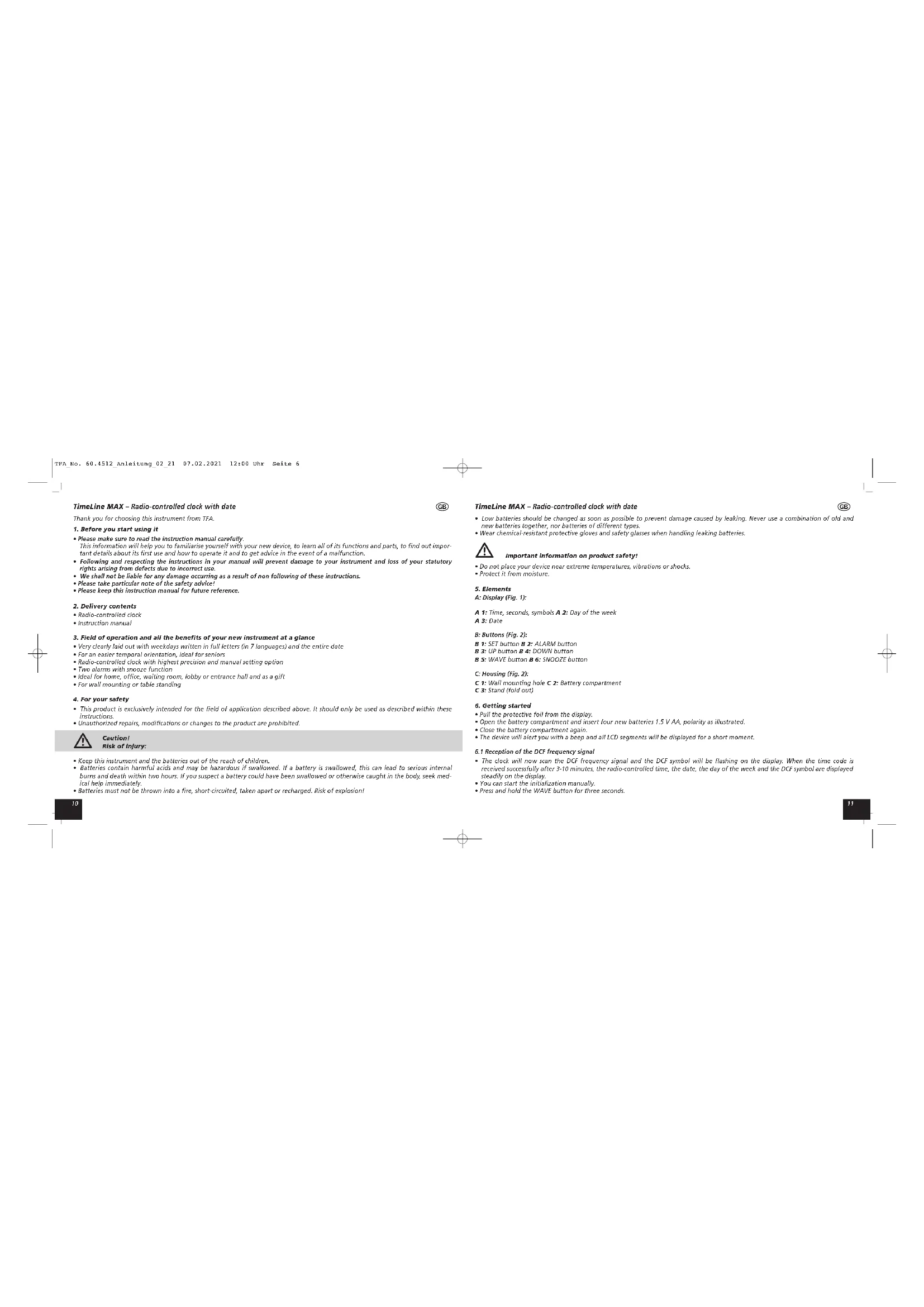 Download the instructions for your Clock in PDF format for free! Find your manual Timeline Max 60.4512.01 - TFA and take your electronic device back in hand. On this page are published all the documents necessary for the use of your device. Timeline Max 60.4512.01 by TFA.