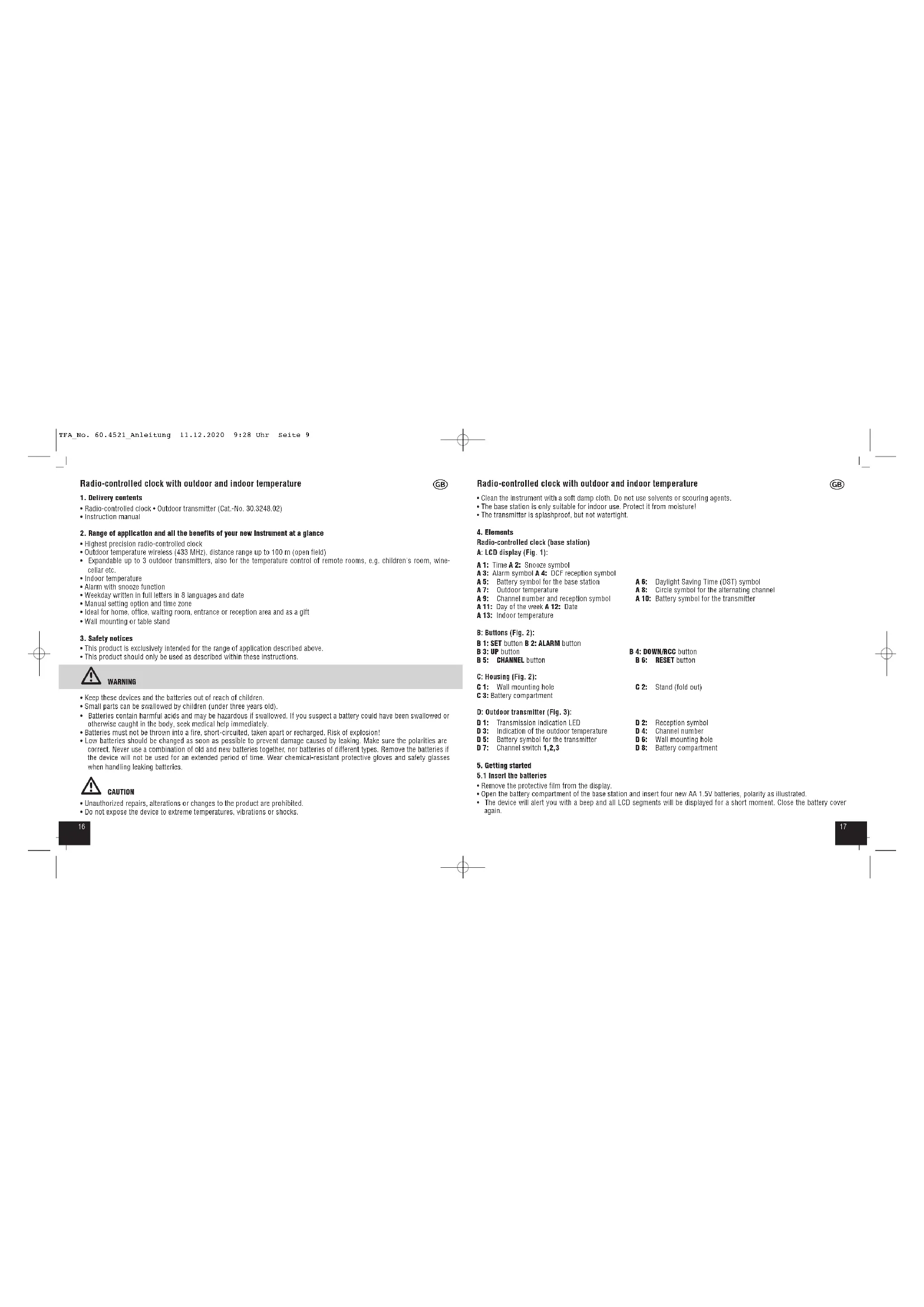 - The device will alert you with a beep and all LCD segments will be displayed for a short moment. Close the battery cover again. TFA_No. 60.4521_Anleitung 11.12.2020 9:28 Uhr Seite 91918 Radio-controlled clock with outdoor and indoor temperature