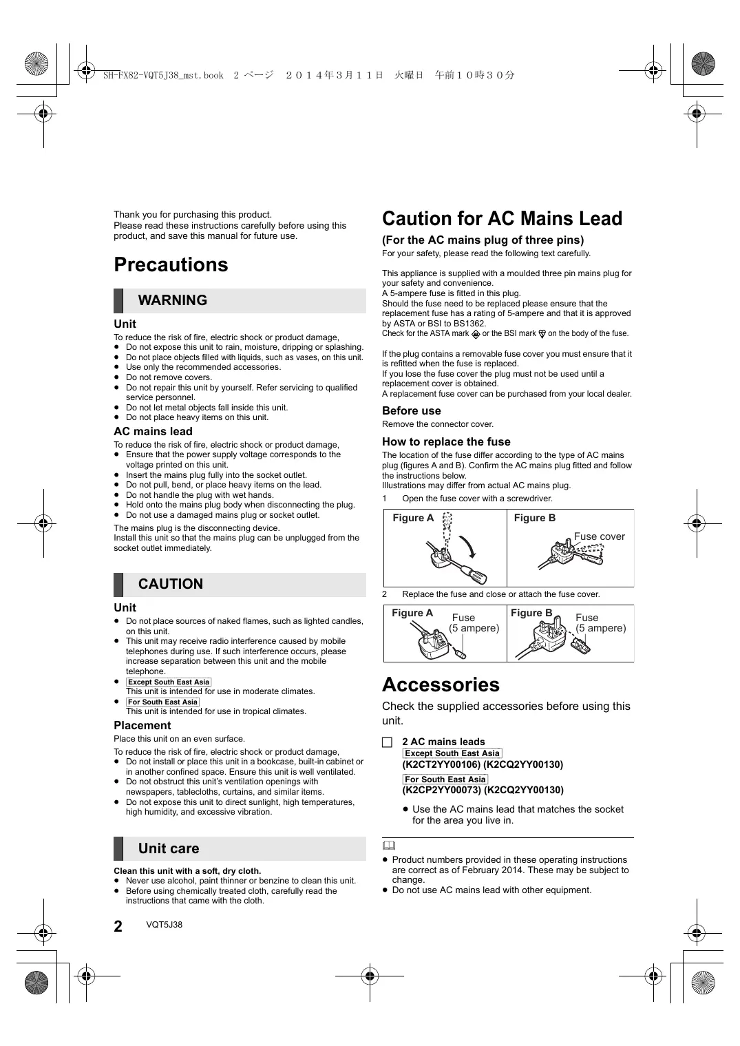 2 AC mains leads [Except\South\East\Asia] (K2CT2YY00106) (K2CQ2YY00130) [For\South\East\Asia] (K2CP2YY00073) (K2CQ2YY00130) ≥ Use the AC mains lead that matches the socket for the area you live in. ≥ Product numbers provided in these operating instructions are correct as of February 2014. These may be subject to change. ≥ Do not use AC mains lead with other equipment. SH-FX82-VQT5J38_mst.book 3 ページ