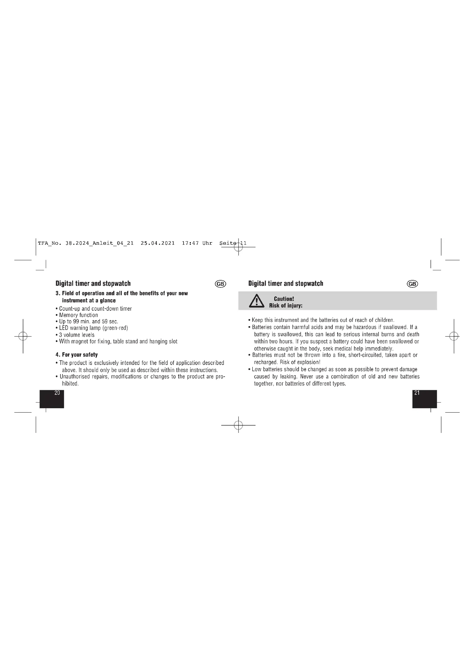 - Low batteries should be changed as soon as possible to prevent damage caused by leaking. Never use a combination of old and new batteries together, nor batteries of different types. TFA_No. 38.2024_Anleit_04_21 25.04.2021 17:47 Uhr Seite 112322 Digital timer and stopwatch