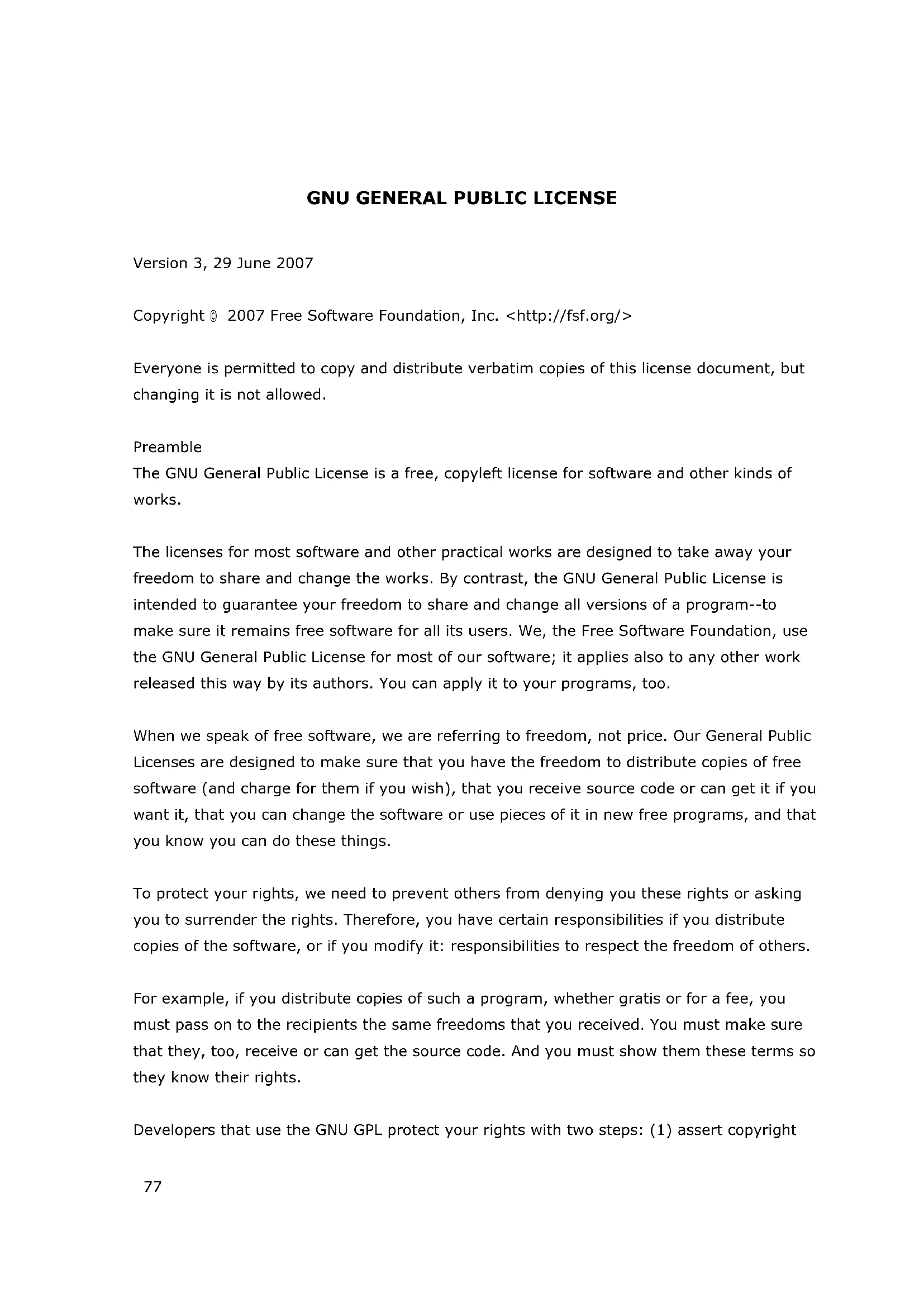 Version 3, 29 June 2007 Copyright © 2007 Free Software Foundation, Inc. <http://fsf.org/> Everyone is permitted to copy and distribute verbatim copies of this license document, but changing it is not allowed. Preamble The GNU General Public License is a free, copyleft license for software and other kinds of works. The licenses for most software and other practical works are designed to take away your freedom to share and change the works. By contrast, the GNU General Public License is intended to guarantee your freedom to share and change all versions of a program--to make sure it remains free software for all its users. We, the Free Software Foundation, use the GNU General Public License for most of our software; it applies also to any other work released this way by its authors. You can apply it to your programs, too. When we speak of free software, we are referring to freedom, not price. Our General Public Licenses are designed to make sure that you have the freedom to distribute copies of free software (and charge for them if you wish), that you receive source code or can get it if you want it, that you can change the software or use pieces of it in new free programs, and that you know you can do these things. To protect your rights, we need to prevent others from denying you these rights or asking you to surrender the rights. Therefore, you have certain responsibilities if you distribute copies of the software, or if you modify it: responsibilities to respect the freedom of others. For example, if you distribute copies of such a program, whether gratis or for a fee, you must pass on to the recipients the same freedoms that you received. You must make sure that they, too, receive or can get the source code. And you must show them these terms so they know their rights. Developers that use the GNU GPL protect your rights with two steps: (1) assert copyright78 on the software, and (2) offer you this License giving you legal permission to copy, distribute and/or modify it. For the developers' and authors' protection, the GPL clearly explains that there is no warranty for this free software. For both users' and authors' sake, the GPL requires that modified versions be marked as changed, so that their problems will not be attributed erroneously to authors of previous versions. Some devices are designed to deny users access to install or run modified versions of the software inside them, although the manufacturer can do so. This is fundamentally incompatible with the aim of protecting users' freedom to change the software. The systematic pattern of such abuse occurs in the area of products for individuals to use, which is precisely where it is most unacceptable. Therefore, we have designed this version of the GPL to prohibit the practice for those products. If such problems arise substantially in other domains, we stand ready to extend this provision to those domains in future versions of the GPL, as needed to protect the freedom of users. Finally, every program is threatened constantly by software patents. States should not allow patents to restrict development and use of software on general-purpose computers, but in those that do, we wish to avoid the special danger that patents applied to a free program could make it effectively proprietary. To prevent this, the GPL assures that patents cannot be used to render the program non-free. The precise terms and conditions for copying, distribution and modification follow.