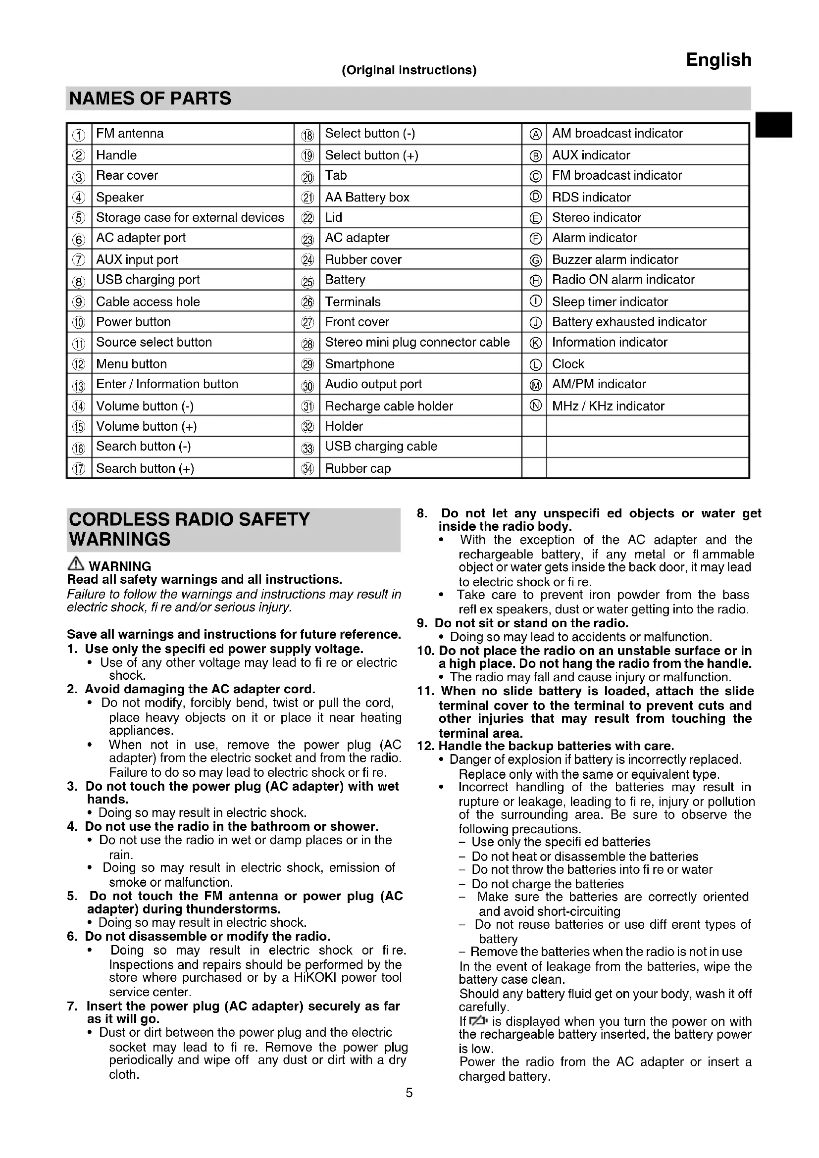 Unexpected problems may result in the loss or corruption of data stored in smartphones and other peripheral equipment connected to the radio. With this possibility in mind, a backup of the data should always be made in advance. Note that HiKOKI cannot be held responsible for the corruption or loss of data stored within smartphones and other peripheral equipment connected to the radio, nor any damage to the equipment itself. MAIN FUNCTIONS ○ Manual/Auto select ○ Save (Memory) (10 AM + 10 FM stations) ○ Radio On/Off /Alarm ○ Dock for playing audio from smartphones and portable audio players ○ High-quality stereo speaker ○ Smartphone and cell phone recharging ○ Compatibility with HiKOKI power tool rechargeable battery and AC adapter SPECIFICATIONS Frequency band FM: 87.5 to 108 MHz AM: 522 to 1629 KHz Antenna FM: Rubber antenna AM: Ferrite bar antenna (built-in) Speaker 90 mm (8 Ω) × 2 Max. power output AC adapter: 5 W × 2