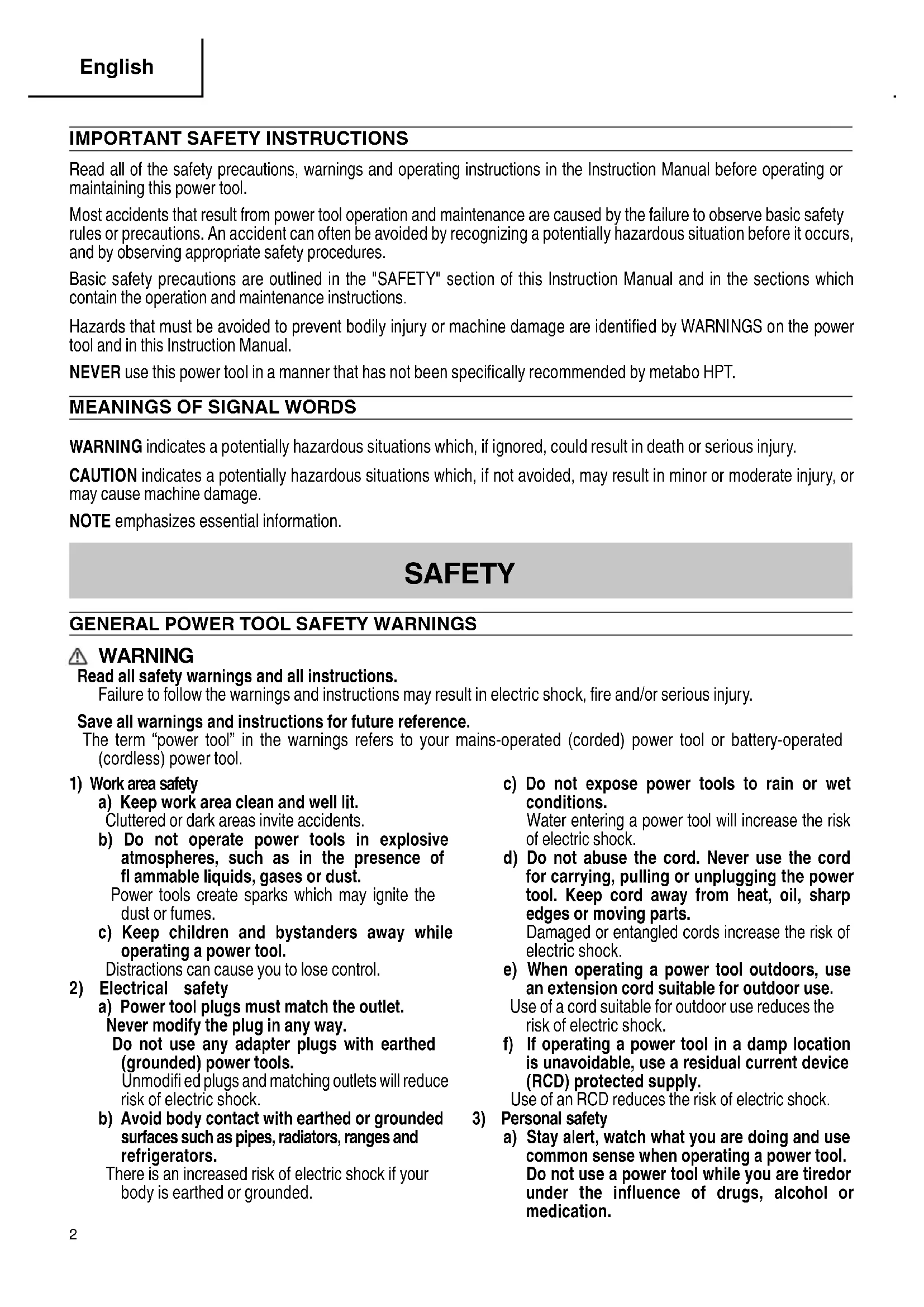 Read all of the safety precautions, warnings and operating instructions in the Instruction Manual before operating or maintaining this power tool. Most accidents that result from power tool operation and maintenance are caused by the failure to observe basic safety rules or precautions. An accident can often be avoided by recognizing a potentially hazardous situation before it occurs, and by observing appropriate safety procedures. Basic safety precautions are outlined in the "SAFETY" section of this Instruction Manual and in the sections which contain the operation and maintenance instructions. Hazards that must be avoided to prevent bodily injury or machine damage are identifi ed by WARNINGS on the power tool and in this Instruction Manual. NEVER use this power tool in a manner that has not been specifi cally recommended by metabo HPT.