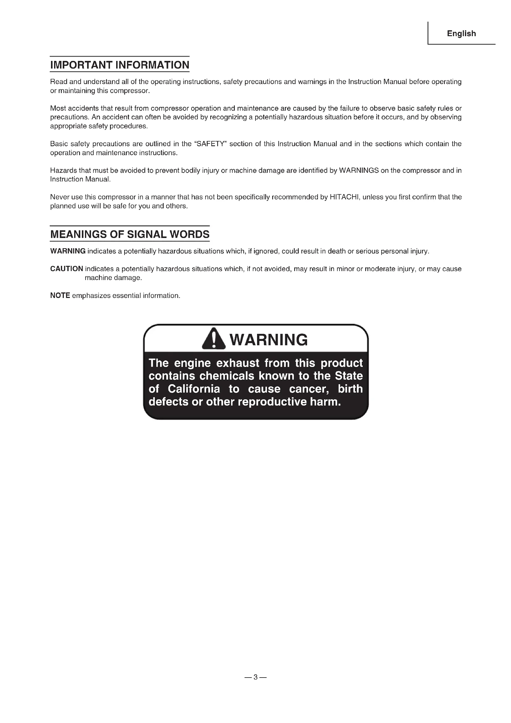 Página Español 000BookEC2610Elowes.indb2000BookEC2610Elowes.indb2 2018/03/0910:24:482018/03/0910:24:48English — 3 — IMPORTANT INFORMATION Read and understand all of the operating instructions, safety precautions and warnings in the Instruction Manual before operating or maintaining this compressor. Most accidents that result from compressor operation and maintenance are caused by the failure to observe basic safety rules or precautions. An accident can often be avoided by recognizing a potentially hazardous situation before it occurs, and by observing appropriate safety procedures. Basic safety precautions are outlined in the “SAFETY” section of this Instruction Manual and in the sections which contain the operation and maintenance instructions. Hazards that must be avoided to prevent bodily injury or machine damage are identifi ed by WARNINGS on the compressor and in Instruction Manual. Never use this compressor in a manner that has not been specifi cally recommended by HITACHI, unless you fi rst confi rm that the planned use will be safe for you and others.